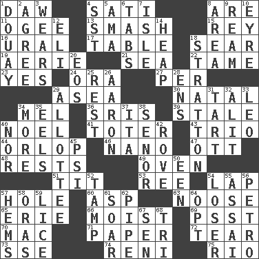 ACROSS 1. Simpleton 4. Suttee (variant) 8. "We ___ not amused" (Victoria) 11. Double curve, resembling the letter S 13. Box-office sellout 15. Marina Del _, California 16. Mountain range 17. Eating place 18. Scorch 19. Nest on high 21. Ocean 22. Not wild 23. Consenting reply 24. Mouth or opening 27. For each 29. At sea 30. Brizilian seaport 34. Cartoonist voice _ Blanc 36. Indian titles of respect 39. Lacking originality or spontaneity 40. Christmas carol 41. Carrier 43. Musical group of three 44. Fourth or lowest deck 46. Billionth: prefix 47. Baseball player Mel 48. Musical pauses 49. Baking chamber 51. Teat (slang) 53. To riddle 54. Pet locale 57. Opening into or through something 60. Cleo's killer 63. Trap for birds or small mammals 65. One of the Great Lakes 66. Wet 69. Inconspicuous attention getter 70. Big _ 71. Some stationery 72. Rend 73. Compass dir. 74. Painter Guido (1575-1642) 75. _ de Janeiro DOWN 1. A city in N France, SE of Calais 2. Match 3. Erodes 4. Fast jet (abbr.) 5. Nanny (var.) 6. Bar bills 7. Capri or Wight 8. Length times width 9. 480, 500 or 516 sheets of paper 10. Jane of fiction 12. Biblical high priest 14. Pile 18. Ski resort town in Vermont 20. Greek goddess of the dawn 25. Relief 26. Composer Copland 28. Followers of ems 29. One to whom something is allotted 31. Small pie 32. Set down 33. Lion 34. Greater amount 35. Snakelike fish 37. Call ___ day 38. Sir (Sp.) 40. And not 42. Be footloose 45. Air pressure measure (abbr.) 50. Car or cant ending 52. Pack (down) 54. Failure 55. Slender Brazilian palm 56. Stone: prefix 57. Folds over and sews together 58. Mouths or openings 59. Louse (plural) 61. Fly high 62. Corncob 64. Choose 67. Elected rep. 68. Three (prefix)