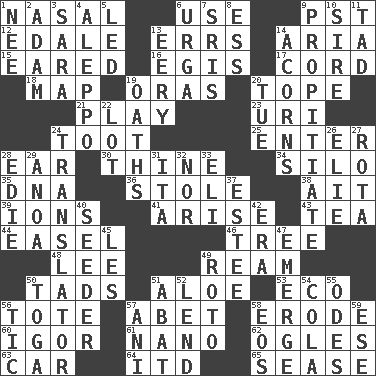 ACROSS 1. Relating to the nose 6. Purpose 9. Pacific Standard Time (abbr.) 12. Peak District village in England 13. Blunders 14. Roberta Peters solo 15. Having ears or earlike features 16. Armor plate that protects the chest 17. Drawstring 18. Atlas unit 19. Mouths or openings 20. Drink excessively 21. Shaw product 23. RI univ. 24. A blast of a horn 25. Keyboard key 28. Hearing organ 30. One or ones belonging to thee 34. Grain storage tower 35. Heredity factor (abbr.) 36. Fur scarf 38. Small island 39. Charged particles 41. Get up 43. Afternoon social gathering 44. Artist's stand 46. Woody plant 48. Area sheltered from the wind 49. 480, 500 or 516 sheets of paper 50. Bits 51. Medicinal plant 53. Environmental prefix 56. Haul 57. Collude with 58. Eat (away) 60. Composer Stravinsky 61. Billionth: prefix 62. Stares 63. 4-wheeled motor vehicle 64. It would 65. Gospel singer Marvin DOWN 1. Born 2. First man 3. "Two Mules for Sister ____" 4. City in Syria 5. Directed 6. Capital and largest city of Mongolia 7. Indian titles of respect 8. Double-curved letter 9. Conciliate 10. The founder of a family 11. Small boy 13. Suggestive of the supernatural 14. Oak nuts 19. Expletives 20. Third day of the wk. 22. Car dealer's back yard 24. Interpreter 26. Writer Wiesel 27. Round or rotation of duties 28. Singer Brickell 29. Small Philippine buffalo 31. Call ___ day 32. Not either 33. Biblical high priest 37. First name in cosmetics 40. Sowing specialist 42. Epoch 45. French article 47. Develop 49. Printing process, for short 50. Ancient Roman robe 51. Blind as ____ 52. Grant temporary use of 54. Root beer relative 55. Lyric poems 56. Nervous spasm 57. Black tropical American cuckoo 58. Greek goddess of the dawn 59. Compass dir.