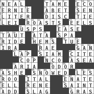 ACROSS 1. Anneal 5. Docile 9. Environmental prefix 12. Bert's buddy 14. Collude with 15. Elected rep. 16. 61 cubic inches 17. Plate 18. Standoff 19. Luau accessory 20. Ridicules or criticizes harshly 23. Snakelike fish 24. United States Postal Service (abbr.) 25. Comfort 27. Strained 30. _ moment's notice (2 wds.) 32. Health resort 33. Travel on an animal 34. Equivocates 36. Third day of the wk. 38. Retirement account (abbr.) 39. Actress Charlotte 40. Separate the seeds from cotton 43. Pet locale 46. Thailand, formerly 48. Quote 49. Police officer (slang) 51. Non-commissioned officer (abbr.) 52. At sea 53. Operatic vocal solo 54. Aroma 56. American tennis player Robert 58. Frozen precipiation fell 61. French article 64. Friend of Pooh 65. Slanted text style (abbr.) 66. Maternal 68. Pipe bend 69. French philosopher Descartes 70. Virtuous person 71. Find the sum of 72. Volcanic refuse 73. Pate de foie ____ DOWN 1. 1994 drama film starring Jodie Foster 2. One of the Great Lakes 3. Against 4. Untruth 5. Small amounts or degrees 6. "This won't hurt ____!" 7. Makes clutter 8. And so on (abbr.) 9. First name in cosmetics 10. To provide with a ceiling 11. Washington bills 13. Blunders 21. Brightly colored fish 22. Michaelmas daisies 23. He sold his birthright 24. Shoshoni 26. Fitting 27. Three (prefix) 28. Wind 29. Freehold land 31. At full speed 35. Manatee 37. Armor plate that protects the chest 41. Had dinner 42. Teachers' org. 44. Measure of real estate 45. Luau course 47. Method 48. 4-wheeled motor vehicle 50. Soft color 53. Hold, grip (Informal) 55. Lyric poems 56. Type of rug 57. Exchanged or delivered for money 59. Grandmother 60. Cassini of fashion 61. Den 62. Inactive volcano in Sicily 63. Arranges properly for use 65. Big collection agency 67. Tired old horse