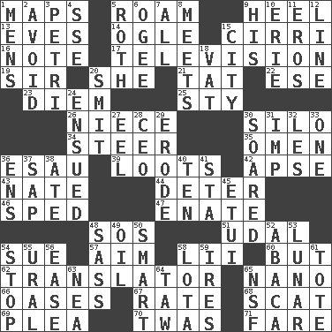 ACROSS 1. Atlas contents 5. Wander 9. Person who is morally reprehensible 13. Nights before holidays 14. Stare at amorously 15. High-altitude cloud 16. Make mention of 17. Household entertainment appliance 19. Title for a knight 20. A female animal or person 21. Make lace 22. Compass dir. 23. South Vietnam president (1954) 25. Filthy place 26. Sibling's daughter 30. Grain storage tower 34. Bull 35. Sign of something about to happen 36. He sold his birthright 39. Plunders 42. Domed church section 43. Nathan's nickname 44. Prevent from occurring 46. Hurried 47. Maternal 48. Distress signal 51. Allodial 54. Take to court 57. Direct toward a target or goal 58. Cards in a Roman deck? 60. On the contrary 62. Interpreter 65. Billionth: prefix 66. Fertile tracts in a desert 67. Pace 68. Scram, to a cat 69. Entreaty 70. It was, poetically 71. Conductor's collection DOWN 1. Not women's 2. Prevent the occurrence of 3. _ dish (used to culture cells) 4. Compass dir. 5. Writer of Portnoy's Complaint (1969) 6. Double curve, resembling the letter S 7. Everything 8. Confronts 9. Part of HMS, perhaps 10. One of the Great Lakes 11. Greek god of love 12. Actor's bit 15. Municipality 18. Large container 20. Stricken, poetically 24. Took place subsequently 27. Snakelike fish 28. Corporate head (abbr.) 29. Wear away 30. Flew 31. Mischievous child 32. French article 33. Single 36. Followers of ems 37. Plant excrement 38. Had dinner 40. "___ Little Indians" 41. R.R. building 45. Needle case 48. Backtalk 49. Petroleum 50. Don Adams' spy role 52. Phillipine bananalike plant 53. Type of eclipse 54. Obstruct or block passage 55. Mountain range 56. Relaxation 58. Globular water bottle used in Asia 59. Angers 61. Carryall 63. Teachers' org. 64. The 23rd letter of the Hebrew alphabet 65. Overdraft (abbr.)