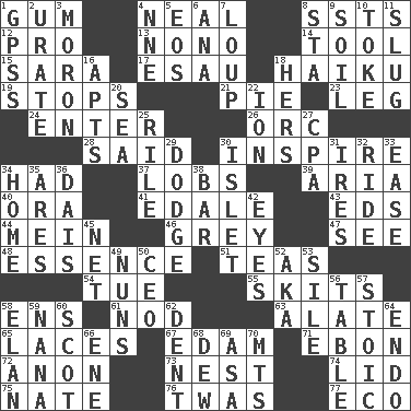ACROSS 1. Chewing product 4. Be tempered by heat 8. Fast planes 12. Adept person 13. Words to Nanette 14. Implement 15. "Two Mules for Sister ____" 17. He sold his birthright 18. Japanese verse 19. Obstructs or blocks passage 21. Sliced dessert 23. Part of a journey 24. Keyboard key 26. The grampus (Milton) 28. Expressed in words 30. Stimulate to action 34. Possessed 37. Tennis shots 39. Roberta Peters solo 40. Mouth or opening 41. Peak District village in England 43. Begley and Asner 44. Chow _ 46. Jennifer or Joel 47. Perceive with the eye 48. Center 51. Afternoon social gatherings 54. Third day of the wk. 55. Burlesque acts 58. Followers of ems 61. Allow head to fall sleepily 63. Having winglike extensions 65. Shoestrings 67. Dutch treat 71. Inky black, to poets 72. At once, immediately (arch.) 73. Egg locale 74. Flaplike covering 75. Nathan's nickname 76. It was, poetically 77. Environmental prefix DOWN 1. Global Positioning Systems (abbr.) 2. A salt of uric acid 3. Person of subnormal intelligence 4. Compass dir. 5. Greek goddess of the dawn 6. Santa ___, CA 7. Central Nebraska county 8. R.R. building 9. Land 10. Casino tip 11. A hard, heavy blow 16. Flats, for short 18. Possessive pronoun 20. Ocean 22. Electrically charged atom 25. Cause heat under the collar 27. Accounting whiz (abbr.) 29. Evade 30. Small island 31. Angers 32. Travel on or in a vehicle 33. Relaxation 34. Dwelling 35. Ancient Greek god of war 36. Raised platform 38. Oblong piece of solid material 42. Snake ____ (dice throw) 45. Remaining after all deductions 49. Religious women 50. Corporate head (abbr.) 52. Alias (abbr.) 53. Drop; flow; fall 56. Eating place 57. Unemotional 58. Enthusiasm 59. Nanny 60. Native of Scotland 62. Undesirable depression on a surface 64. Inside; within (prefix) 66. Compass dir. 68. Morning condensation 69. White ___ sheet 70. Mountains (abbr.)