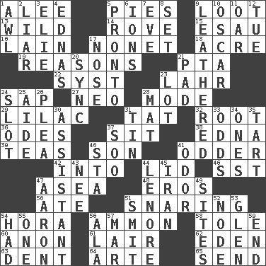 ACROSS 1. Toward shelter 5. Sliced desserts 9. Spoils 13. Rampant 14. Be footloose 15. He sold his birthright 16. (Had) reclined 17. Music written for nine 18. 43,560 square feet 19. Thinks logically 21. Parent Teacher Assoc. 22. System (abbr.) 23. Cowardly lion portrayer 24. Plant excrement 27. Modern: prefix 28. Method 29. Pale purple color 31. Make lace 32. Carrot, for example 36. Lyric poems 37. Be seated 38. Pulitzer Prize-winning author Ferber 39. Afternoon social gatherings 40. Male offspring 41. More peculiar 42. To the inside or interior of 44. Hat (slang) 46. Fast jet (abbr.) 47. Toward the sea 48. Greek god of love 50. Had dinner 51. Catching in a trap 54. Israeli folk dance 56. ID or VA city 58. Lacquered or enameled metalware 60. Soon (poet.) 61. Den 62. Paradise 63. Gouge 64. Johnson of "Laugh-In" 65. Transmit DOWN 1. Leather borer 2. One who doesn't tell the truth 3. Writer Wiesel 4. Ferber et al. 5. Right away 6. Charged atoms 7. First lady 8. Arrange properly for use 9. Tough but pliablecoriaceous 10. Motion picture award 11. Boat paddle 12. Third day of the wk. 17. Olfactory organ 20. Synchronize (abbr.) 21. Writing tablet 23. Car dealer's back yard 24. Narrow opening 25. Assistant 26. Entreaty 28. Floor protector 30. Helper 31. Metal container 33. Probability 34. Singles 35. Small pie 37. "Barney Miller" actor Jack 40. R.R. building 41. Scent 43. Born 44. Poe poem 45. SW Asia republic 47. Composer Copland 49. Settings 51. Stricken, poetically 52. Connecting point 53. Small, secluded valley 54. Possessed 55. Single 56. Insect wing 57. Spoil 59. Conclude