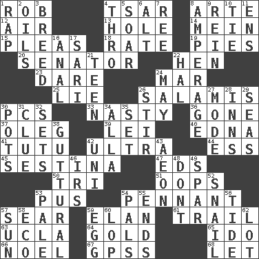 ACROSS 1. Director Reiner 4. Russian ruler of old 8. Johnson of "Laugh-In" 12. Wind 13. Opening into or through something 14. Chow _ 15. Entreaties 18. Assign a rank or rating to 19. Sliced desserts 20. Legislator 22. Layer 23. Have the gumption 24. Third mo. 25. Whopper 26. Deli grouping 30. Personal Computers (abbr.) 33. Offensive 36. Went 37. Cassini of fashion 39. Flowery wreath 40. Pulitzer Prize-winning author Ferber 41. Ballerina skirt 42. Extreme 44. Double-curved letter 45. French poetic form 47. Begley and Asner 50. Three (prefix) 51. I made a mistake 53. Product of festering 54. Pre-World Series prize 57. Dry up 59. Flair 61. Get behind 63. Southern CA. univ. 64. Aureate 65. Wedding promise 66. Christmas carol 67. Global Positioning Systems (abbr.) 68. Allow DOWN 1. Strike 2. Petroleums 3. A special lineage 4. Through, poetically 5. Fly high 6. Keyboard modifier key 7. To sift 8. Electrical Measurement 9. It's straight from the horse's mouth 10. Standoff 11. Followers of ems 16. Of or related to the anus 17. Indian skirt 21. Adolescent 22. Actor Linden 24. Fifth month 26. Commotion 27. Method 28. Restaurants 29. Oceans 30. Cooking vessels 31. A slight indication 32. Puts into a specified state 34. Silent film actress Nazimova 35. Put into a specified state 38. From the throat 42. Corn or form start 43. A really long time 46. Big collection agency 48. Do not 49. Practice fight 52. Slow-paced one 53. Light colored 54. Friends 55. Extremities 56. Event that recurs at intervals 57. Player for Phoenix 58. Environmental prefix 59. Ovum 60. Chop off 62. Car dealer's back yard