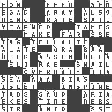 ACROSS 1. A really long time 4. Nourish 8. Elected rep. 11. Mild oath 13. Like ___ of sunshine 14. In addition 15. Former U.S. Attorney General Janet 16. Pace 17. Suttee (variant) 18. Had a strong desire 21. Domesticates 22. Cause to be 23. At a great distance 25. Compass dir. 26. Label 29. Copy Pinocchio 32. Having winglike extensions 34. Mouth or opening 35. Sound made by sheep 38. Fermented drink made from hops 39. NE Netherlands city 41. Spanish pot 43. Biblical high priest 44. Actress Charlotte 45. Slow-paced one 46. Make much ado about nothing 50. Call ___ day 51. Ocean 54. American Automobile Association (abbr.) 55. Prejudice 57. Small island 59. Motivate 63. Small amounts or degrees 64. Saudi Arabian king (1953-1964) 67. Operatic vocal solo 68. Supplements with great effort 69. Become fatigued 70. Confederate soldiers (slang) 71. Title for a knight 72. Among 73. Fast jet (abbr.) DOWN 1. Suggestive of the supernatural 2. Double curve, resembling the letter S 3. Grandmother 4. Bundle 5. Epoch 6. Consume 7. Color 8. Shuts with force 9. _____ Park, CO 10. Annoying sound 12. Dormintory (informal) 14. White ___ sheet 19. Nathan's nickname 20. Supplement with great effort 21. Three (prefix) 23. Conductor's collection 24. ____ Jay Lerner 26. Keyboard key 27. Toward shelter 28. Highlander 30. Failure 31. Inky black, to poets 33. Musical group of three 36. Jai ____ 37. Came down and settled, as after flight 39. Type of rug 40. "Two Mules for Sister ____" 42. Wing 45. Oceans 47. Large container 48. Remained 49. Metal container 51. Locates 52. 1973 Nobel Price Winner (Physics) Leo 53. Tree or shrub in the Birch family 56. Practice fight 58. Curvy letter 60. Angers 61. Teases 62. 90 degrees 64. R.R. building 65. Direct toward a target or goal 66. RI univ.