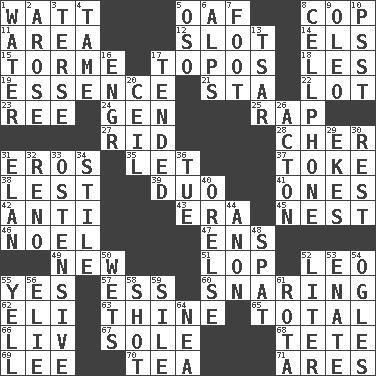 ACROSS 1. Electrical Unit 5. Clumsy lout 8. Police officer (slang) 11. Type of rug 12. Groove 14. Raised railways 15. Singer Mel 17. Literary convention 18. French article 19. Center 21. R.R. building 22. Car dealer's back yard 23. To sift 24. Commissioned mil. rank 25. Reproach for some lapse or misdeed 27. To free from 28. "Mermaids" star 31. Greek god of love 35. Allow 37. Puff or smoke 38. For fear that 39. Superhero pair 41. Singles 42. Opposed to 43. Epoch 45. Egg locale 46. Christmas carol 47. Followers of ems 49. ___ Haven, CT 51. Trim (branches) 52. Lion 55. Consenting reply 57. Curvy letter 60. Catching in a trap 62. Connecticut Ivy Leaguer 63. One or ones belonging to thee 65. Add up to 66. 54 in ancient Rome 67. Flatfish 68. False hair 69. Area sheltered from the wind 70. Afternoon social gathering 71. Ancient Greek god of war DOWN 1. Wetness 2. Came up 3. Laconic 4. Docile 5. Bear (Spanish) 6. High mountains 7. 12 inches 8. Portable communications device 9. Butter sub 10. Inconspicuous attention getter 13. Russian ruler of old 16. Engineer (abbr.) 17. Watched over 20. To provide with a ceiling 26. NE Massachussets city 29. Supplements with great effort 30. State of inaction 31. Flair 32. Western Nevada city 33. Clearly or manifestly demonstrative 34. Vertical member of a panel or frame 36. Third day of the wk. 40. Threatening words 44. At once, immediately (arch.) 48. Argument over a trivial matter 50. Soaks 52. 61 cubic inches 53. Related on the mother's side 54. Stares at amorously 55. Shout 56. Writer Wiesel 58. Went for two points 59. Drop; flow; fall 61. Round or rotation of duties 64. Teachers' org.
