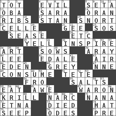ACROSS 1. Small child 4. Morally bad or wrong 8. Stalk of a moss capsule 12. Chief or king in Benin or Nigeria 13. "Two Mules for Sister ____" 14. NW Algerian seaport 15. Chest bones 17. Comedian Laurel of Laurel & Hardy 18. Derisive sound 19. Cell (Danish) 21. Turn to the right 23. Mayday 24. Gospel singer Marvin 26. And so on (abbr.) 28. Shout 30. Motivate 34. Tate display 37. Sty mamas 39. Like ___ of sunshine 40. Area sheltered from the wind 41. Peak District village in England 43. Atmosphere 44. Locale of original sin 46. Jennifer or Joel 47. Compass dir. 48. Eat 51. Wig 54. Back 55. Table seasonings 58. Erode 61. Deep reverence 63. Make _____ (do battle with) 65. The principal food of baleen whales 67. Drug cop 71. Nanny 72. Inactive volcano in Sicily 73. Passed on 74. Floor covering 75. Ooze 76. Lyric poems 77. Before (prefix) DOWN 1. Torque (variant) 2. Off-Broadway awards 3. Eating place 4. Double-curved letter 5. Large container 6. Retirement account (abbr.) 7. Long (Scottish) 8. Boy, to dad 9. Greek god of love 10. Edible starchy tuberous root 11. Pismires 16. Kill 18. Arranges properly for use 20. Compass dir. 22. Car or cant ending 25. Otherwise 27. Tax preparer (abbr.) 29. Inn 30. Small island 31. SW Asia republic 32. Water falling in drops from the sky 33. Jane of fiction 34. Actor Baldwin 35. Redecorate 36. Adolescent 38. Armed conflict 42. Sight organs 45. Overdraft (abbr.) 49. Mountain range 50. Cut the grass 52. The 23rd letter of the Hebrew alphabet 53. Liveliness 56. _____ steamer (cargo ship) 57. Echolocation 58. Makes supply last 59. Johnson of "Laugh-In" 60. Prong on a fork 62. Inside; within (prefix) 64. Nathan's nickname 66. Infant locale 68. Help 69. Portuguese money of account (variant) 70. Music discs