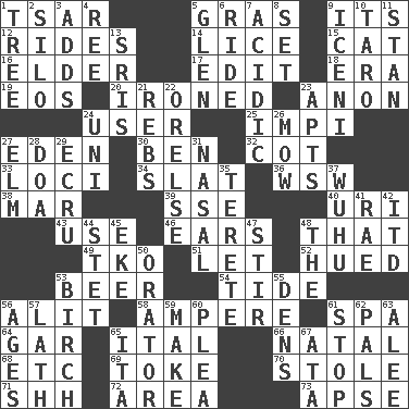 ACROSS 1. Russian ruler of old 5. Pate de foie ____ 9. ___ a Wonderful Life 12. Amusement-park features 14. Louse (plural) 15. Feline 16. A person who is older than you are 17. Prepare for publication 18. Period 19. Greek goddess of the dawn 20. Pressed 23. Soon (poet.) 24. One who uses or employs something 25. Body of Kaffir warriors 27. Locale of original sin 30. Benjamin's nick name 32. Small bed 33. Event scenes 34. Narrow board 36. Compass dir. 38. Spoil 39. Compass dir. 40. RI univ. 43. Purpose 46. Hearing organs 48. Not this but _ 49. Ring climax 51. Allow 52. Became colored 53. Fermented drink made from hops 54. Periodic rise and fall of the sea level 56. Came down and settled, as after flight 58. Electrical Unit 61. Health resort 64. Slender fish 65. Slanted text style (abbr.) 66. Brizilian seaport 68. And so on (abbr.) 69. Casino tip 70. Fur scarf 71. Quiet! 72. Type of rug 73. Domed church section DOWN 1. Family _ (genealogy) 2. Grain storage tower 3. Sums up 4. To sift 5. Small, secluded valley 6. Travel on an animal 7. Being or containing an acid 8. Put into a specified state 9. Ancient Celtic tribe of eastern Britain 10. Edible starchy tuberous root 11. Comedian Laurel of Laurel & Hardy 13. Indian titles of respect 21. Confederate soldiers (slang) 22. Threatening words 23. Tenement units (abbr.) 24. Single; one (prefix) 26. Cut the grass 27. Shade tree 28. ___ good deed 29. Shade of tan 31. Relating to the nose 35. Cylindrical with tapered ends 37. Chinese city south-southwest of Nanjing 41. Actress Charlotte 42. It would 44. Proofreading order 45. Supplement with great effort 47. Use a spoon 48. Definite Article 50. Speaker 53. A tree used for making furniture 55. Hiding places for outlaws 56. Eras 57. Thin strip of wood or metal 59. Cause to be 60. Entreaty 61. Constrict 62. Friends 63. Toward shelter 65. Call ___ day 67. "One Day ___ Time"