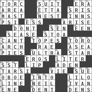 ACROSS 1. Torque (variant) 5. Set or collection 9. Period 12. Type of rug 13. Singer James 14. Indian titles of respect 15. Vertical spar for supporting sails 16. Egg locale 17. Taverns 18. 23rd letter of the Greek alphabet 19. Double-curved letter 21. Get up 22. Do not 24. Elected rep. 26. Car or cant ending 27. Gospel singer Marvin 28. Portico 29. Patter 30. Drinks excessively 32. "Corrida" creature 36. Bowlike part 37. Actress Charlotte 38. Toward the sea 39. Sliced desserts 40. Extremist 42. Play the lead 43. Greek god of love 44. 61 cubic inches 46. Fast jet (abbr.) 49. Mouth edge 50. Arabian gulf 51. Tarsus (plural) 53. Compete 54. Institute legal proceedings 57. Mitch Miller's instrument 58. To the inside or interior of 61. _ and Stitch 62. Actor's bit 63. Famous astronaut Armstrong 64. _ the terrible 65. Compass dir. 66. Undesirable depression on a surface 67. Lairs DOWN 1. Pack (down) 2. Mouths or openings 3. Home 4. Feline 5. Elected reps. 6. Shoshoni 7. ___ a Wonderful Life 8. Make lace 9. Bert's buddy 10. Remove soap 11. NE Netherlands city 14. Title for a knight 19. Followers of ems 20. Proofreading order 21. Santa ___, CA 23. Curses 24. Navigate 25. Greek goddess of the dawn 27. Indian skirt 28. Arguments over trivial matters 29. Head covering 31. Lowest deck of a ship 32. Clothes sense 33. Clearly or manifestly demonstrative 34. Bring up, as a child 35. Rowing implement 40. RI univ. 41. Mountain range southwest of Kyrgyzstan 43. Biblical high priest 45. Binary compound 46. Took without asking 47. Unit of acoustic absorption 48. Heavy duty weighing machine 52. Perceive with the eye 53. Electrical Unit 55. ____ Bator, Mongolia 56. Immeasurably long periods of time 58. Indiana (abbr.) 59. Born 60. Shallow baking pan 61. Hat (slang)