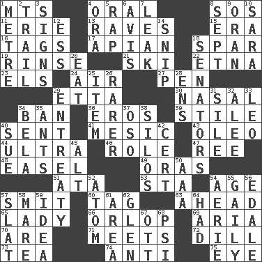 ACROSS 1. Mountains (abbr.) 4. Spoken 8. Distress signal 11. One of the Great Lakes 13. All-night dance parties 15. Period 16. Labels 17. Bee-related 18. Coast Guard woman 19. Remove soap 21. What Jean-Claude Killy likes to do 22. Inactive volcano in Sicily 23. Raised railways 24. Wind 27. Fenced enclosure 29. Singer James 30. Relating to the nose 34. Forbid 36. Greek god of love 39. Vertical member of a panel or frame 40. Emitted 41. Of or pertaining to a meson 43. Margarine 44. Extremist 46. Hero or heavy, e.g. 47. To separate or throw off 48. Artist's stand 49. Mouths or openings 51. _ moment's notice (2 wds.) 53. R.R. building 54. Personal question 57. Stricken, poetically 60. Label 63. At or in the front 65. Kenny Rogers chart-topper in '80 66. Lowest deck of a ship 69. Operatic vocal solo 70. "We ___ not amused" (Victoria) 71. Confronts 72. Deli pickle 73. Afternoon social gathering 74. Opposed to 75. Sight organ DOWN 1. Distance measurement (Brit.) 2. Get behind 3. Public displays of written messages 4. Mouth or opening 5. Strike 6. Advice 7. Path through which fluid escapes 8. Back-to-school mo. 9. NW Algerian seaport 10. "Two Mules for Sister ____" 12. Curvy letter 14. Clip 18. Elected representatives 20. Erode 25. A distinct part 26. More uncommon 28. Followers of ems 29. Plea 31. Filth; sediment 32. Toward shelter 33. Lion 34. Actor Lugosi 35. Pismires 37. Bear (Spanish) 38. Grain storage towers 40. Institute legal proceedings 42. Foregone conclusion 45. Keyboard modifier key 50. Auto club (abbr.) 52. Smallest unit of an element 54. Nest on high 55. Lightheartedly 56. Peak District village in England 57. Narrow board 58. Female horse 59. It may be bright or harebrained 61. Length times width 62. Small, secluded valley 64. Possessed 67. Baseball player Mel 68. Air pressure measure (abbr.)