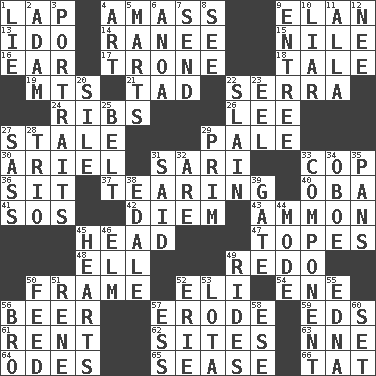 ACROSS 1. Pet locale 4. Collect or gather 9. Liveliness 13. Wedding promise 14. The wife of a rajah (variant) 15. "Death on the ____" 16. Hearing organ 17. Marketplace scale 18. Story 19. Mountains (abbr.) 21. Small amount or degree 22. Father Junipero _ 24. Chest bones 26. Area sheltered from the wind 27. Showing deterioration from age 29. Light colored 30. Satellite of Uranus 31. Indian skirt 33. Police officer (slang) 36. Be seated 37. Lacerating 40. Chief or king in Benin or Nigeria 41. Mayday 42. South Vietnam president (1954) 43. ID or VA city 45. Froth on beer 47. Drinks excessively 48. Pipe bend 49. Make new 50. Movie unit 52. Connecticut Ivy Leaguer 54. Compass dir. 56. Fermented drink made from hops 57. Eat (away) 59. Begley and Asner 61. Monthly bill 62. Settings 63. Compass dir. 64. Lyric poems 65. Gospel singer Marvin 66. Make lace DOWN 1. Whopper 2. First man 3. Likenesses of persons 4. Nonscientific branch of learning 5. Shops 6. Small Philippine buffalo 7. Transmit 8. Perceive with the eye 9. Main course 10. One who doesn't tell the truth 11. Silent film actress Nazimova 12. Born 20. Filth; sediment 22. Killed 23. Snakelike fish 25. Waist strap 27. Backtalk 28. Musical group of three 29. Demure 31. Alleged 32. "We ___ not amused" (Victoria) 33. Piece 34. Mitch Miller's instrument 35. Baking dishes 38. Peak District village in England 39. Yard entry 44. Method 45. Centers of feelings and intuitions 46. Shade tree 49. Amusement-park features 50. Nourish 51. French philosopher Descartes 52. One of the Great Lakes 53. Globular water bottle used in Asia 55. Pulitzer Prize-winning author Ferber 56. Sis' sibling 57. Double-curved letter 58. Compass dir. 60. Arrange properly for use