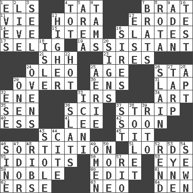 ACROSS 1. Raised railways 4. Make lace 7. Naughty child 11. Compete 12. Israeli folk dance 13. Wear away 14. First lady 15. Detail 16. Chalkboards 17. Former Milwaukee Brewers owner Bud 19. Helper 21. Quiet! 23. Angers 24. Butter sub 25. Personal question 26. R.R. building 29. Unconcealed 30. Followers of ems 31. Infant locale 32. Compass dir. 33. Big collection agency 34. Tate display 35. Elected rep. 36. _-fi 37. Remove all contents or possession from 40. Curvy letter 41. Area sheltered from the wind 42. Within a short period 43. Glance over 45. Teat (slang) 46. Determination 51. Domineers 55. Foolish or stupid persons 56. Greater amount 58. Sight organ 59. Impressive in appearance 60. Prepare for publication 61. Compass dir. 62. Celtic language 63. Modern: prefix 64. Lair DOWN 1. Nights before holidays 2. Moving, as bait 3. Stitch closed the eyes of (a falcon) 4. Small child 5. Type of rug 6. Scottish caps 7. Naughty children 8. Round or rotation of duties 9. Arabian gulf 10. Trial 12. Having greater elevation 13. Otherwise 16. Fathers 18. Small island 20. Signals 22. Being at a high temperature 24. Baking chambers 25. Nest on high 26. Killed 27. Canvas cover 28. Fitting 29. Singles 32. Compass dir. 33. Ancient Celtic tribe of eastern Britain 36. Narrow boards 37. Fast jet (abbr.) 38. Bathroom plumbing fixture 39. Printing process, for short 43. Took without asking 44. Quote 46. Trig term 47. Aroma 48. Teases 49. Sign of something about to happen 50. Connecting point 52. Tear apart 53. Unit of force 54. Stitched 57. River (Sp.)