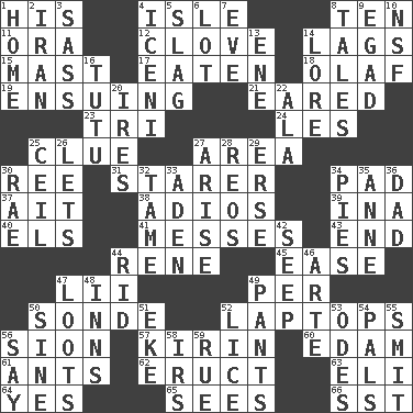 ACROSS 1. Part of HMS, perhaps 4. Capri or Wight 8. "___ Little Indians" 11. Mouth or opening 12. Garlic unit 14. Straggles 15. Vertical spar for supporting sails 17. Consumed 18. Norwegian king 19. Taking place subsequently 21. Having ears or earlike features 23. Three (prefix) 24. French article 25. A slight indication 27. Length times width 30. To sift 31. A viewer who gazes fixedly 34. Writing tablet 37. Small island 38. Goodbye (Sp.) 39. _ tizzy (2 wds.) 40. Raised railways 41. Makes clutter 43. Conclude 44. French philosopher Descartes 45. Comfort 47. Cards in a Roman deck? 49. For each 50. Message 52. Portable computers 56. The Jewish people; Israel 57. Japanese brewing company 60. Dutch treat 61. Pismires 62. Spew [out] 63. Biblical high priest 64. Affirmative reply 65. Perceives with the eye 66. Fast jet (abbr.) DOWN 1. Residence 2. SW Asia republic 3. Backtalk 4. Ancient Celtic tribe of eastern Britain 5. Volcanic refuse 6. Car dealer's back yard 7. Night before a holiday 8. Falsehoods 9. Mild oath 10. Overdraft (abbr.) 13. Compass dir. 14. Old wives' tales, e.g. 16. Ballerina skirt 20. Angers 22. Wing 25. To provide with a ceiling 26. Allows 27. Ascend 28. Vintage cars 29. Celtic language 30. Actress Charlotte 32. Not wild 33. Arabian gulf 34. Sliced desserts 35. Queen of England 1702-14 36. June honoree 42. Ooze 44. To free from 46. Johnson of "Laugh-In" 47. Plunders 48. Lodging establishments 49. Leg coverings 50. Trig term 51. Supplement with great effort 52. Louse (plural) 53. Lyric poems 54. Friends 55. Stricken, poetically 56. Declare 58. Big collection agency 59. Regret