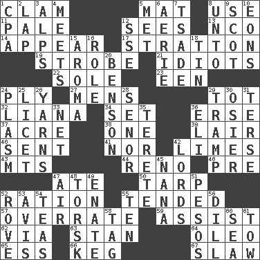ACROSS 1. Dollar (slang) 5. Floor protector 8. Purpose 11. Light colored 12. Perceives with the eye 13. Non-commissioned officer (abbr.) 14. Seem 17. Ski resort town in Vermont 19. Disco prop 21. Foolish or stupid persons 22. Flatfish 23. Car or cant ending 24. Travel a route regularly 27. Not women's 29. Small child 32. Woody, climbing, usually tropical plant 34. Put into a specified state 36. Celtic language 37. 43,560 square feet 38. Single 39. Den 40. Transmitted 41. Not either 42. Citrus fruits 43. Mountains (abbr.) 44. Former U.S. Attorney General Janet 46. Before (prefix) 47. Had dinner 50. Canvas cover 52. Food allowance for one day 55. Watched over 57. Make much ado about nothing 59. Help 62. By way of 63. Comedian Laurel of Laurel & Hardy 64. Butter sub 65. Double-curved letter 66. Barrel 67. Cole _ (cabbage dish) DOWN 1. Numbers guy (abbr.) 2. Pet locale 3. High mountains 4. Confronts 5. Was introduced to 6. Nest on high 7. Sadhe (variant) 8. To (old English) 9. Highlander 10. Immeasurably long periods of time 12. Compass dir. 15. Scent 16. Hero or heavy, e.g. 18. Shallow baking pan 20. Gillaume's butler role 24. Suffix with ecto or cyto 25. It is permitted: Lat. 26. Entertaining tales 28. Sir (Sp.) 29. _____ steamer (cargo ship) 30. Flexible twig of a willow tree 31. Laconic 33. Remaining after all deductions 35. Cigar-shaped 36. Biblical high priest 42. Domineers 45. Grandmother 47. Wind 48. Cod relative 49. Related on the mother's side 51. Mexican monetary units 52. Be footloose 53. Advice 54. Afternoon social gatherings 55. "___ Little Indians" 56. Deli pickle 58. Label 60. Ocean 61. Pull behind