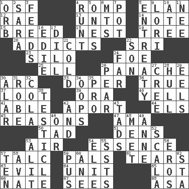 ACROSS 1. Order of Saint Francis (abbr.) 4. Play 8. Liveliness 12. Actress Charlotte 13. To (old English) 14. Brief written record 15. A special lineage 18. A home for chicks 19. Family _ (genealogy) 20. Inveterate users 22. Indian title of respect (Mr.) 23. Grain storage tower 24. Enemy 25. Pipe bend 26. Flamboyance 30. Curve 33. Drug addict 36. Loyal 37. Spoils 39. Mouth or opening 40. Shout 41. Competent 42. To the left, to Queeg 44. Raised railways 45. Thinks logically 47. Housemaid (var.) 50. Small boy 51. Habitations of wild animals 53. Atmosphere 54. Gist 57. Baby powder 59. Friends 61. Separates forcefully 63. Morally bad or wrong 64. A single undivided whole 65. Car dealer's back yard 66. Nathan's nickname 67. Perceives with the eye 68. White ___ sheet DOWN 1. Globe 2. "Two Mules for Sister ____" 3. Eats 4. The smallest animal of a litter 5. Singles 6. Mountains (abbr.) 7. Cooking vessel 8. Plea 9. Australian parrot (variant) 10. Had dinner 11. Born 16. Singer Brickell 17. Deli pickle 21. Lacking warmth 22. Male child 24. Distant 26. Lightbulb-shaped fruit 27. Algonquian 28. Frame or body of a ship 29. Snakelike fish 30. Having or resembling wings 31. Loose flowing garment 32. Root beer relative 34. I made a mistake 35. Adept person 38. One of the two male reproductive glands 42. Also 43. Bits 46. Boat paddle 48. Confront 49. Queen of England 1702-14 52. Any of the three canals of the cochlea 53. Set down 54. Writer Wiesel 55. Fast planes 56. Greek god of love 57. Nine, plus one 58. Actress Gardner 59. Product of festering 60. A saturated hydrocarbon 62. R.R. building