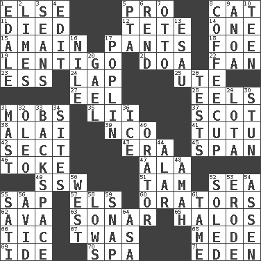 ACROSS 1. Otherwise 5. Adept person 8. Feline 11. Passed on 12. False hair 14. Single 15. With great haste 17. Leg coverings 18. Enemy 19. Small, flat, pigmented spot on the skin 21. ___ good deed 22. Air blower 23. Curvy letter 24. Infant locale 25. Shoshoni 27. Snakelike fish 28. Snakelike fish 31. Disorderly crowds 35. Cards in a Roman deck? 37. Native of Scotland 38. Jai _ 39. Non-commissioned officer (abbr.) 41. Ballerina skirt 42. Religious group 43. Epoch 45. Connect, as a bridge 46. Casino tip 47. Chicken ___ king 49. Compass dir. 51. Scottish cap 52. Ocean 55. Plant excrement 57. Raised railways 60. Speakers 62. Actress Gardner 63. Echolocation 65. Saint headwear 66. Nervous spasm 67. It was, poetically 68. Ancient Persian 69. Binary compound 70. Health resort 71. Genesis locale DOWN 1. Peak District village in England 2. Citrus fruits 3. Actors Connery and Penn 4. Prepare for publication 5. Parent Teacher Association (abbr.) 6. Tear apart 7. Von Bismarck 8. Java holder (2 wds.) 9. Small Philippine buffalo 10. Adolescent 13. Son of Isaac 16. Mediterranean tributary 17. Cotton for raincoats, e.g. 20. Highlander 26. Trials 29. Globular water bottle used in Asia 30. Surprise greatly 31. Vertical spar for supporting sails 32. Margarine 33. Keyboard key 34. Locates 36. Frozen water 40. Speaker 44. Having or resembling wings 48. Nursemaid 50. Compass direction 52. Having a sole or soles 53. Wear away 54. NE Netherlands city 55. Suttee (variant) 56. Enthusiastic 58. Coldest temperatures 59. Fastener 61. Docile 64. White ___ sheet
