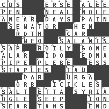 ACROSS 1. Music discs 4. Celtic language 8. Toward shelter 12. Fenced enclosure 13. Anneal 14. Undercover agent 15. Approach 18. 24-hour periods 19. Ache 20. Legislator 22. Layer 23. Writer of Portnoy's Complaint (1969) 24. Auto 25. Modern: prefix 26. Deli grouping 30. Plant excrement 33. Agitated, as a liquid 36. Went 37. Having or resembling wings 39. Wedding promise 40. Pulitzer Prize-winning author Ferber 41. Corncob 42. Military trainee 44. Double-curved letter 45. Paper fasteners 47. The 19th letter of the Greek alphabet 50. Rowing implement 51. Capital and largest city of Mongolia 53. Globe 54. Winter's stalactites 57. Table seasoning 59. Singer James 61. Damascus' land 63. Stare at amorously 64. Ooze 65. Electrically charged atom 66. Shrivel 67. Scottish caps 68. Conclude DOWN 1. Numbers guy (abbr.) 2. Cub Scout units 3. Contemptuous expression 4. Inside; within (prefix) 5. Tail end 6. Declare 7. Raised railways 8. Electrical Measurement 9. Grant temporary use of 10. Biblical high priest 11. Car or cant ending 16. At once, immediately (arch.) 17. Assign a rank or rating to 21. Son of Odin 22. Actor Linden 24. Island 26. Oscar Madison type 27. Method 28. Lodging establishments 29. Oceans 30. Plant excrements 31. Set down 32. Dad 34. Lubricates 35. Binary compound 38. Newsperson 42. For each 43. Needle holder 46. Experiment locale 48. Curves 49. Unsightly 52. Nest on high 53. Rounded earthenware pot or jar 54. A distinct part 55. Balmoral and tarboosh 56. The Jewish people; Israel 57. Mayday 58. Mature 59. Eastern Standard Time (abbr.) 60. Beverage made from leaves 62. Added to
