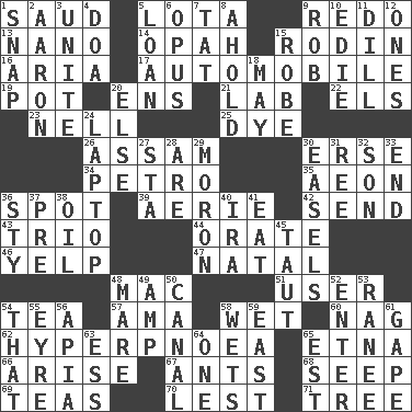 ACROSS 1. Saudi Arabian king (1953-1964) 5. Globular water bottle used in Asia 9. Do over again 13. Billionth: prefix 14. Brightly colored fish 15. "The Thinker" sculptor 16. Operatic vocal solo 17. Form of transportation 19. Plant holder 20. Followers of ems 21. Experiment locale 22. Raised railways 23. 1994 drama film starring Jodie Foster 25. Color 26. Indian state 30. Celtic language 34. Stone: prefix 35. A really long time 36. Blemish 39. Nest on high 42. Post 43. Musical group of three 44. Speak pompously 46. Sharp bark 47. Brizilian seaport 48. Apple computer (short form) 51. One who uses or employs something 54. Beverage made from leaves 57. Wet nurse (var.) 58. Dripping 60. Tired old horse 62. Abnormally rapid or deep breathing 65. Inactive volcano in Sicily 66. Get up 67. Pismires 68. Ooze 69. Beverages made from leaves 70. For fear that 71. Woody plant DOWN 1. Fastener 2. Composer Copland 3. Join together 4. ___ good deed 5. Grant temporary use of 6. Musical composition 7. Make lace 8. Hold, grip (Informal) 9. Director Reiner 10. Singer Brickell 11. Deli pickle 12. Washington bills 15. Loose flowing garment 18. Fifth month 20. Otherwise 24. Portable computer 27. R.R. building 28. "We ___ not amused" (Victoria) 29. Person of subnormal intelligence 30. Artist's stands 31. To riddle 32. Manchild 33. Conclude 36. Filthy place 37. Before (prefix) 38. Lubricate 40. Retirement account (abbr.) 41. Ingest 45. Pulled tight 48. Female horse 49. Electrical Unit 50. Lessep's creation 52. Keyboard key 53. The wife of a rajah (variant) 54. Not this but _ 55. Jane of fiction 56. Capital of Western Samoa 58. Moistens 59. 90 degrees 61. Open wide 63. Curvy letter 64. Single 65. Eastern Standard Time (abbr.)