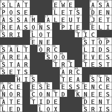 ACROSS 1. Narrow board 5. She-sheep 8. White ___ sheet 11. Airs 12. Allows 14. Lair 15. Indian state 17. Native American of Southwest Alaska 18. _ stream 19. Thinks logically 21. Sliced dessert 22. Biblical high priest 23. _ Lanka 24. Car dealer's back yard 25. Nervous spasm 27. Compass dir. 28. Obstruct or block passage 31. Table seasoning 35. The grampus (Milton) 37. Flaplike coverings 38. Type of rug 39. "Barney Miller" actor Jack 41. Nights before holidays 42. Play the lead 43. Three (prefix) 45. Trial 46. Puts into a specified state 47. Curve 49. Part of HMS, perhaps 51. Afternoon social gathering 52. Title for a knight 55. Adept person 57. Compass dir. 60. Core 62. Not either 63. Continued (abbr.) 65. Leg joints 66. Had dinner 67. Periodic rise and fall of the sea level 68. Gouge 69. Directed 70. Brine-cured salmon 71. Indian titles of respect DOWN 1. Practice fights 2. Failure 3. Slender Brazilian palm 4. Afternoon social gatherings 5. Pipe bend 6. Shed a tear 7. Needle holder 8. Descriptive word 9. Sew up the eyelids of hawks and falcons 10. Against 13. Proofreading order 16. Undercover agent 17. Michaelmas daisies 20. Words to Nanette 26. Small island 29. Lyric poems 30. Inconspicuous attention getter 31. Backtalk 32. Johnson of "Laugh-In" 33. Resembling or made to resemble leather 34. Tarsus (plural) 36. Small bed 40. Declaimed 44. Angers 48. Keg 50. Religious group 52. Scornful expression 53. Ancient Celtic tribe of eastern Britain 54. Musical pauses 55. Of or related to the anus 56. ____ d'Azur (French Riviera) 58. Earth 59. Inside; within (prefix) 61. Conclusions 64. John Ritter's dad