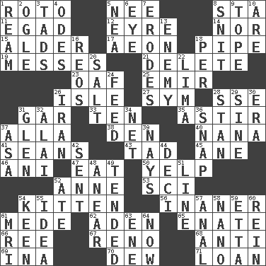 ACROSS 1. Printing process, for short 5. Born 8. R.R. building 11. Mild oath 12. Jane of fiction 14. Not either 15. Tree or shrub in the Birch family 17. A really long time 18. Corncob 19. Makes clutter 21. Keyboard key 23. Clumsy lout 25. Arab leader 26. Capri or Wight 27. Symbol (abbr.) 28. Compass dir. 31. Slender fish 33. "___ Little Indians" 35. Moving about 37. Silent film actress Nazimova 38. Lair 40. Grandmother 41. Seines 43. Small boy 45. A saturated hydrocarbon 46. Cuckoo 47. Erode 50. Sharp bark 52. Queen of England 1702-14 53. _-fi 54. Baby cat 56. More lacking in sense or substance 61. Ancient Persian 62. An important port of Yemen 65. Related on the mother's side 66. To sift 67. Western Nevada city 68. Against 69. _ tizzy (2 wds.) 70. Morning condensation 71. Grant temporary use of DOWN 1. 480, 500 or 516 sheets of paper 2. Stare at amorously 3. Bits 4. Lyric poems 5. Teachers' org. 6. Sight organ 7. Eats (away) 8. In a ____ (agitated or irritated) 9. Drink excessively 10. "We ___ not amused" (Victoria) 13. Foe 16. Vintage cars 18. For each 20. Table seasoning 22. Pale green bean 24. Nourish 26. SW Asia republic 28. Comedian Laurel of Laurel & Hardy 29. Trig term 30. Epoch 31. Small, secluded valley 32. Jai _ 34. Fish or hair follower 36. Fastener 37. White ___ sheet 39. Negative votes 42. Transmitted 44. Tenth: prefix 48. Approach 49. Watched over 51. Actor's bit 52. Had dinner 54. Peachy ____! 55. The main thing one is thinking about 57. Of or related to the anus 58. Billionth: prefix 59. Singer James 60. It's straight from the horse's mouth 61. Medical imaging device (abbr.) 63. Compass dir. 64. Immediately
