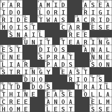 ACROSS 1. Distant 4. Among 8. Toward the sea 12. Wedding promise 13. Australian parrot (variant) 14. Swiss mountan, "Queen of the Mountains" 15. Travel on an animal 17. It was, poetically 18. Sour-tasting 19. Wet 21. Auto 23. Compass dir. 24. Slow-paced one 26. To separate or throw off 28. A single undivided whole 30. Separating forcefully 34. Eastern Standard Time (abbr.) 37. "Vaya con ____" 39. Of or related to the anus 40. Compass dir. 41. Small fatty European fish 43. Compass dir. 44. One who doesn't tell the truth 46. Writing tablets 47. Manchild 48. Slender, wiry 51. Compass direction 54. Superhero pair 55. Debaucheries 58. It would 61. Two (Sp.) 63. Hang back 65. One or ones belonging to thee 67. Comfort 71. Spanish pot 72. Algonquian 73. Small Philippine buffalo 74. Shade tree 75. Dwelling 76. For fear that 77. Compass dir. DOWN 1. Unshakable 2. Goodbye (Sp.) 3. "The Thinker" sculptor 4. Keyboard modifier key 5. Cut the grass 6. Lyricist Gershwin 7. Flat circle 8. Curve 9. Father 10. Armor plate that protects the chest 11. Helper 16. He sold his birthright 18. Type of rug 20. Metal container 22. "We ___ not amused" (Victoria) 25. Hats (slang) 27. Epoch 29. Likely to tip or tilt 30. Sadhe (variant) 31. Taverns 32. Billionth: prefix 33. Small, secluded valley 34. Snakelike fish 35. In a ____ (agitated or irritated) 36. Lacerate 38. Mouth or opening 42. Russian ruler of old 45. To free from 49. Unadorned 50. Thick or sticky substance 52. Be seated 53. "Corrida" creature 56. Falsehoods 57. Beverly of Met fame 58. Hankering 59. Through, poetically 60. South Vietnam president (1954) 62. Lick closed 64. Unable to walk 66. Born 68. A saturated hydrocarbon 69. Distress signal 70. Erode