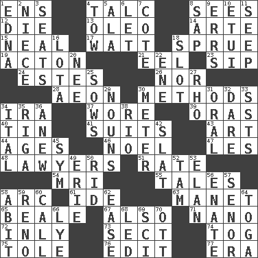 ACROSS 1. Followers of ems 4. Baby powder 8. Perceives with the eye 12. Pass on 13. Butter sub 14. Johnson of "Laugh-In" 15. Be tempered by heat 17. Electrical Unit 18. Disorder 19. NE Massachussets city 21. Snakelike fish 23. Small drink 24. _____ Park, CO 26. And not 28. A really long time 30. Modes 34. Retirement account (abbr.) 37. Had on 39. Mouths or openings 40. Metal container 41. Sets or collections 43. Tate display 44. Matures 46. Christmas carol 47. French article 48. Those who practice law 51. Assign a rank or rating to 54. Medical imaging device (abbr.) 55. Lies 58. Curve 61. Binary compound 63. French painter Edouard 65. Memphis, Tenn. Street 67. In addition 71. Billionth: prefix 72. In an inward manner 73. Religious group 74. Coat; cloak 75. Lacquered or enameled metalware 76. Prepare for publication 77. Period DOWN 1. Pulitzer Prize-winning author Ferber 2. Sibling's daughter 3. Theater features 4. Pull behind 5. Wing 6. Allow 7. ____ d'Azur (French Riviera) 8. Plant excrement 9. Blunders 10. Needle holder 11. Ooze 16. Globular water bottle used in Asia 18. Position in a hierarchy or organization 20. Born 22. Compass dir. 25. Sty mamas 27. 17th letter of the Greek alphabet 29. Parts of speech 30. Distance measurement 31. Of the mouth 32. Have the gumption 33. Fast planes 34. Slanted text style (abbr.) 35. Capital of Latvia 36. Afresh 38. River (Sp.) 42. Narrow board 45. Symbol (abbr.) 49. 4th largest of the Great Lakes 50. To free from 52. Scottish cap 53. Style 56. Related on the mother's side 57. Sir (Sp.) 58. "This won't hurt ____!" 59. Former U.S. Attorney General Janet 60. Give a ring to 62. Relaxation 64. Ancient Roman robe 66. Sodium hydroxide 68. Directed 69. _-fi 70. Baseball player Mel