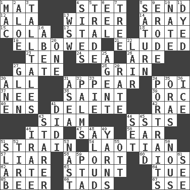 ACROSS 1. Floor protector 4. Proofreading order 8. Transmit 12. According to 13. One who wires 14. Like ___ of sunshine 15. Root beer relative 17. Showing deterioration from age 18. Carry 19. Turned at an angle; bent 21. Dodged 23. "___ Little Indians" 24. Ocean 26. "We ___ not amused" (Victoria) 27. Yard entry 28. Smile widely 30. Everything 31. Seem 34. Luau course 37. Born 38. Virtuous person 39. The grampus (Milton) 40. Followers of ems 41. Keyboard key 42. Actress Charlotte 43. Thailand, formerly 44. Fast planes 46. It would 47. Declare 50. Hearing organ 51. Put through a sieve 54. Of or relating to Laos or its people 57. One who doesn't tell the truth 58. To the left, to Queeg 60. "Vaya con ____" 62. Johnson of "Laugh-In" 63. Difficult or unusual or dangerous feat 64. Third day of the wk. 65. Fermented drink made from hops 66. Small boys 67. Compass dir. DOWN 1. Apple computer (short form) 2. _ vera 3. Baron Munchausen's specialties 4. Settings 5. Swap 6. Snakelike fish 7. Family _ (genealogy) 8. Titan orbits this 9. Eat (away) 10. Nathan's nickname 11. Colored 13. Compass dir. 16. Collude with 20. Single 22. Den 25. Representative 27. Small, secluded valley 29. Assign a rank or rating to 30. A saturated hydrocarbon 31. At sea 32. Insides of hands 33. Sliced dessert 34. Likenesses of persons 35. Mouths or openings 36. Frozen water 41. "You Light Up My Life" star Conn 43. A viewer who gazes fixedly 44. Arrange properly for use 45. Alleged 46. Feeling or showing extreme anger 48. Verbally 49. Tall tales 51. Thick slice 52. Become fatigued 53. Political cartoonist Thomas 55. Baseball player Mel 56. Common sense 59. Parent Teacher Assoc. 61. Observe