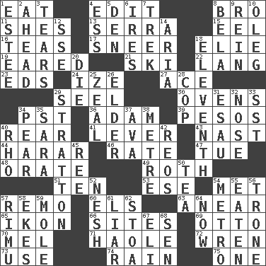 ACROSS 1. Ingest 4. Prepare for publication 8. Sis' sibling 11. "______ My Girl" (Turtles hit) 13. Father Junipero _ 15. Snakelike fish 16. Beverages made from leaves 17. Scornful expression 18. Writer Wiesel 19. Having ears or earlike features 21. What Jean-Claude Killy likes to do 22. Austrian-born American filmmaker Fritz 23. Begley and Asner 24. Ending with capital 27. Adept person 29. Stitch closed the eyes of (a falcon) 30. Baking chambers 34. Pacific Standard Time (abbr.) 36. First of billions? 39. Mexican monetary units 40. Hitchcock's "____ Window" 41. Crowbar 43. Political cartoonist Thomas 44. Ethiopian city, capital of Harari 46. Pace 47. Third day of the wk. 48. Declaim 49. Writer of Portnoy's Complaint (1969) 51. Nine, plus one 53. Compass dir. 54. Was introduced to 57. San ____ (Riviera town) 60. Raised railways 63. Approach 65. Visual representation of an object 66. Locates 69. "Beetle Bailey" pooch 70. Cartoonist voice _ Blanc 71. White Person, in Hawaii 72. Songbird 73. Purpose 74. Water falling in drops from the sky 75. Single DOWN 1. First name in cosmetics 2. Having the leading position 3. Lacerates 4. Curvy letter 5. Lair 6. Angers 7. Long journey 8. Actor Lugosi 9. It's straight from the horse's mouth 10. Cassini of fashion 12. Compass dir. 14. Operatic vocal solo 18. Veterans Day date 20. Pass on 25. Ardor 26. A person who is older than you are 28. Police officer (slang) 29. Ski resort town in Vermont 31. Son of Isaac 32. Sense of smell 33. Fast jet (abbr.) 34. Lightbulb-shaped fruit 35. "Two Mules for Sister ____" 37. Actress Gardner 38. Distance measurement (Brit.) 40. 17th letter of the Greek alphabet 42. Vintage cars 45. Portuguese money of account (variant) 50. Afternoon social gathering 52. Soft 54. Paris' subway 55. Consumed 56. Marketplace scale 57. Tall New Zealand timber tree 58. Supplements with great effort 59. Undercover agent 61. One who doesn't tell the truth 62. Portico 64. At this time 67. Biblical high priest 68. Elected rep.