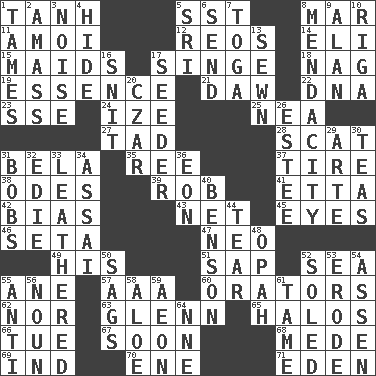 ACROSS 1. Hyperbolic tangent 5. Fast jet (abbr.) 8. Spoil 11. Mine, in Marseilles 12. Vintage cars 14. Biblical high priest 15. Unmarried girls 17. Burn superficially 18. Tired old horse 19. Center 21. Simpleton 22. Heredity factor (abbr.) 23. Compass dir. 24. Ending with capital 25. Teachers' org. 27. Small amount or degree 28. Scram, to a cat 31. Actor Lugosi 35. To separate or throw off 37. Hoop that covers a wheel 38. Lyric poems 39. Director Reiner 41. Singer James 42. Prejudice 43. Fish or hair follower 45. Sight organs 46. Stalk of a moss capsule 47. Modern: prefix 49. Part of HMS, perhaps 51. Plant excrement 52. Ocean 55. A saturated hydrocarbon 57. Auto club (abbr.) 60. Speakers 62. And not 63. American astronaut and politician John 65. Rings 66. Third day of the wk. 67. Within a short period 68. Ancient Persian 69. Indiana (abbr.) 70. Compass dir. 71. Paradise DOWN 1. Makes less strong or intense 2. Collect or gather 3. Annoying sound 4. Flintstone garb 5. _ Lanka 6. Post 7. Ancient Roman robe 8. Ananias' fault 9. ____ Jay Lerner 10. Port city in Latvia 13. Stitched 16. In a ____ (agitated or irritated) 17. Sowing specialist 20. Russian ruler of old 26. First name in cosmetics 29. Johnson of "Laugh-In" 30. Afternoon social gatherings 31. Moves up and down 32. Singer Brickell 33. Tough but pliablecoriaceous 34. Slender Brazilian palm 36. A really long time 40. Gillaume's butler role 44. Separate forcefully 48. Brightly colored fish 50. Settles 52. Having a sole or soles 53. Eat (away) 54. NE Netherlands city 55. Opposed to 56. Part of speech 58. _ vera 59. Period of immesurable duration 61. Docile 64. Compass dir.