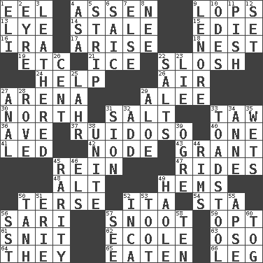 ACROSS 1. Snakelike fish 4. NE Netherlands city 9. Chops off 13. Potassium hydroxide 14. Showing deterioration from age 15. Singer Brickell 16. Lyricist Gershwin 17. Ascend 18. Egg locale 19. And so on (abbr.) 21. Frozen water 22. Agitate, as a liquid 24. Aid 26. Wind 27. Sports stadium 29. Toward shelter 30. _ pole 31. Table seasoning 33. The 23rd letter of the Hebrew alphabet 36. "___ Maria" 37. Noisy, rowdy, vocal (Spanish) 40. Single 41. Directed 42. Thickened enlargement 43. Let have 45. It's straight from the horse's mouth 47. Amusement-park features 48. Keyboard modifier key 49. Folds over and sews together 50. Laconic 52. Call ___ day 54. R.R. building 56. Indian skirt 57. Snob 59. Elect 61. In a ____ (agitated or irritated) 62. Learning spot: Fr. 63. Bear (Spanish) 64. Those people 65. Ingested 66. Part of a journey DOWN 1. Connecticut Ivy Leaguer 2. Jane of fiction 3. Tough but pliablecoriaceous 4. White ___ sheet 5. Remove all contents or possession from 6. Ketch in the Levant 7. Otherwise 8. Born 9. Poe poem 10. Lyric poems 11. Expression of disdain 12. Put into a specified state 20. Penny 22. Table seasonings 23. Falsehood 25. Cowardly lion portrayer 27. Of or related to the anus 28. Be footloose 29. Medicinal plant 31. The Jewish people; Israel 32. Say or write further 33. Inedible or poisonous agaric 34. Queen of England 1702-14 35. Moistens 38. Join together 39. Legendary monster 44. Basketball hoops 45. Noteworthy scarcity 46. Raised railways 49. White Person, in Hawaii 50. Hyperbolic tangent 51. 4th largest of the Great Lakes 52. South American Indian 53. A blast of a horn 55. Domed church section 56. Fast jet (abbr.) 57. Perceive with the eye 58. Nine, plus one 60. Coat; cloak