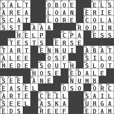 ACROSS 1. Table seasoning 5. Mitch Miller's instrument 9. Raised railways 12. Length times width 13. Grant temporary use of 14. One of the Great Lakes 15. Scram! 16. Old wives' tales, e.g. 17. Root beer relative 18. Fast jet (abbr.) 19. Auto club (abbr.) 21. "The Thinker" sculptor 22. Aid 24. Tax preparer (abbr.) 26. Double-curved letter 27. Trials 28. Celtic language 29. Small pie 30. World-weariness 32. Blind as ____ 36. Toward shelter 37. Order of Saint Francis (abbr.) 38. Grain storage tower 39. Ancient Persian 40. 180 degrees 42. Groove 43. Stockings 44. Peak District village in England 46. Observe 49. A saturated hydrocarbon 50. Unfeeling 51. Artist's stand 53. Bear (Spanish) 54. The grampus (Milton) 57. Johnson of "Laugh-In" 58. To provide with a ceiling 61. Move on water 62. Sew up the eyelids of hawks and falcons 63. "____ silly question..." 64. Capital and largest city of Mongolia 65. Begley and Asner 66. Coral collection 67. Dutch treat DOWN 1. Backtalk 2. Arches 3. Tough but pliablecoriaceous 4. Make lace 5. Water jar 6. Oct. 31 cry 7. Rowing implement 8. Compass dir. 9. Eat (away) 10. Ms. Damita and namesakes 11. Actors Connery and Penn 14. Environmental prefix 19. The first octave above the treble staff 20. Domed church section 21. Actress Charlotte 23. First name in cosmetics 24. An unpleasant substance 25. 23rd letter of the Greek alphabet 27. Lie 28. Take place subsequently 29. Scottish cap 31. Trap for birds or small mammals 32. Indian state 33. Big road sign 34. _ vera 35. Small child 40. Male offspring 41. Coop moms 43. Actor Linden 45. Superhero pair 46. Gospel singer Marvin 47. Having ears or earlike features 48. _____ Park, CO 52. Snakelike fish 53. Norwegian king 55. Port city in Latvia 56. Dollar (slang) 58. Automobile 59. Compass dir. 60. Eisenhower's nickname 61. Take to court