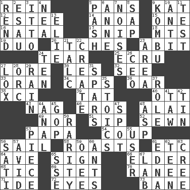 ACROSS 1. It's straight from the horse's mouth 5. Zero-star reviews 9. Krazy ___ of comics 12. First name in cosmetics 14. Small Philippine buffalo 15. Single 16. Relating to or accompanying birth 17. Clip 18. Mountains (abbr.) 19. Superhero pair 20. Skin irritations 23. "This won't hurt ____!" 24. Pull into pieces 25. Shade of tan 27. Old wives' tales, e.g. 30. French article 32. Perceive with the eye 33. Northwest Algerian city 34. Smile enhancers 36. Rowing implement 38. One more than ninety 39. Make lace 40. Baseball player Mel 43. Tired old horse 46. Greek god of love 48. Jai ____ 49. And not 51. Small drink 52. Stitched 53. Dad 54. Overturn; upset 56. Travel by water 58. Ridicules or criticizes harshly 61. And so on (abbr.) 64. "___ Maria" 65. Public display of a written message 66. A person who is older than you are 68. Nervous spasm 69. Proofreading order 70. Indian princess (variant) 71. Binary compound 72. Snake ____ (dice throw) 73. Object of repulsion DOWN 1. Tear apart 2. Son of Isaac 3. "Tell ____ the Marines!" 4. Teachers' org. 5. Romantic infatuation 6. Queen of England 1702-14 7. Annoying sounds 8. Plant excrement 9. Dried seaweed eaten as food 10. Against 11. Trial 13. Writer Wiesel 21. Baby powder 22. Cause to be 23. Type of rug 24. Nine, plus one 26. Corporate head (abbr.) 27. Brine-cured salmon 28. The grampus (Milton) 29. Water falling in drops from the sky 31. Practice fights 35. Unemotional ones 37. Hero or heavy, e.g. 41. The 23rd letter of the Hebrew alphabet 42. Metal container 44. Of or related to the anus 45. Grand Old Party 47. Specific locale 48. Viper 50. Noteworthy scarcity 53. Part 55. One who makes use of a thing 56. Suttee (variant) 57. Enthusiastic 59. Double curve, resembling the letter S 60. Pismires 61. Pulitzer Prize-winning author Ferber 62. Adolescent 63. Algonquian 65. Compass dir. 67. Experiment locale