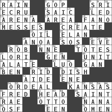 ACROSS 1. Precipitation 5. Grand Old Party 8. Indian title of respect (Mr.) 11. Shade of tan 12. Ketch in the Levant 14. Directed 15. Sports stadium 17. Type of rug 18. Papal veil 19. Makes clutter 21. Make 23. Petroleum 25. Liveliness 26. Small Philippine buffalo 27. Mayday 28. Night before a holiday 31. Director Reiner 33. Compass dir. 35. Lugs 37. Australian parrot (variant) 38. Commissioned mil. rank 40. A single undivided whole 41. Having winglike extensions 43. Nilotic language 45. Separate the seeds from cotton 46. Benjamin's nick name 47. To free from 50. Food container 52. Assistant 53. Compass dir. 54. Severe or trying experience 56. Sunflower state 61. Flintstone 62. Froth on beer 65. Virtuous person 66. Actress Charlotte 67. "Beetle Bailey" pooch 68. Nanny 69. Order of Saint Francis (abbr.) 70. Car or cant ending 71. Sign of something about to happen DOWN 1. 480, 500 or 516 sheets of paper 2. Measure of real estate 3. Angers 4. Religious women 5. Girls' org. (abbr.) 6. Rowing implement 7. Components 8. Narrow board 9. French philosopher Descartes 10. Wedding promise 13. Monte _, Las Vegas Hotel/Casino 16. A really long time 18. Air blower 20. The Jewish people; Israel 22. Compass direction 24. Long (Scottish) 26. "This won't hurt ____!" 28. Inactive volcano in Sicily 29. Distinctive style or manner 30. Eastern Standard Time (abbr.) 31. Hero or heavy, e.g. 32. NW Algerian seaport 34. Snakelike fish 36. Ending for "Through" and "Enough" 37. Experiment locale 39. Unadorned 42. One of the Great Lakes 44. Pig sound 48. Potato state 49. Keyboard key 51. Oceans 52. Find the sum of 54. Mouths or openings 55. Coral collection 57. Billionth: prefix 58. Thailand, formerly 59. Singer Murray 60. Comedian Laurel of Laurel & Hardy 61. Away 63. Had dinner 64. Spanish title