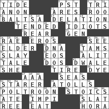 ACROSS 1. Event that recurs at intervals 5. Pacific Standard Time (abbr.) 8. Three (prefix) 11. At once, immediately (arch.) 12. Ancient Greek god of war 13. Friend of Pooh 14. Greek mezzo-soprano Agnes 17. Conveyance 19. Looked after 21. Foolish or stupid persons 22. Bring up, as a child 23. Commissioned mil. rank 24. Actress Charlotte 27. Greek god of love 29. Observe 32. A person who is older than you are 34. Heredity factor (abbr.) 36. Scottish caps 37. Kill 38. Greek goddess of the dawn 39. Set down 40. Lie 41. Two (Sp.) 42. A sleeping potion; an opiate (poet.) 43. A female animal or person 44. Hoop that covers a wheel 46. Color 47. American Automobile Association (abbr.) 50. Oceans 52. A viewer who gazes fixedly 55. Ringlike coral islands and reefs 57. Characterized by complete cowardliness 59. Unemotional ones 62. Had dinner 63. Body of Kaffir warriors 64. Narrow board 65. To separate or throw off 66. Erode 67. Israeli folk dance DOWN 1. Bar bill 2. _ tizzy (2 wds.) 3. Dunce 4. Keyboard key 5. Before (prefix) 6. Former Milwaukee Brewers owner Bud 7. Sadhe (variant) 8. Musical group of three 9. Carrot, for example 10. Charged atoms 12. Find the sum of 15. Scornful expression 16. The sixth month of the Jewish calendar 18. Metal container 20. Eaten away 24. Musical pauses 25. Assad's deity 26. Peak District village in England 28. Snob 29. First course 30. Poet Dickinson 31. First name in cosmetics 33. Sight organ 35. Help 36. The 23rd letter of the Hebrew alphabet 42. Started a card game 45. Vintage cars 47. Tate display 48. Nest on high 49. Odor 51. Make a splashing sound 52. Practice fight 53. Lug 54. Toward shelter 55. Black tropical American cuckoo 56. Grain storage tower 58. Choose 60. Automobile 61. R.R. building