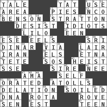 ACROSS 1. Lie 5. Make lace 8. Purpose 11. Length times width 12. Sliced desserts 13. Non-commissioned officer (abbr.) 14. Gillaume's butler role 17. Ski resort town in Vermont 19. Stop 21. Foolish or stupid persons 22. _ and Stitch 23. Car or cant ending 24. Compass dir. 27. Snakelike fish 29. _ Lanka 32. Middle Eastern gold or silver currency 34. By way of 36. Den 37. SW Asia republic 38. Raised railways 39. Inactive volcano in Sicily 40. Wig 41. Mayday 42. Robbery 43. Compass dir. 44. Father 46. Born 47. Wet nurse (var.) 50. Automatically 52. Spoke pompously 55. Ringlike coral islands and reefs 57. Accusation by an informer 59. Dirtied 62. Heredity factor (abbr.) 63. Roll call or roster of names 64. Be footloose 65. Elected rep. 66. Eastern Standard Time (abbr.) 67. Adolescent DOWN 1. Bar bill 2. "We ___ not amused" (Victoria) 3. Grant temporary use of 4. Artist's stand 5. Teat (slang) 6. Nest on high 7. Sadhe (variant) 8. To (old English) 9. Highlander 10. Immeasurably long periods of time 12. Pacific Standard Time (abbr.) 15. Flexible twig of a willow tree 16. "Death on the ____" 18. Metal container 20. Finds the solution 24. Proofreads 25. Male parents of animals 26. Maternal 28. Grain storage towers 29. Smooth fabric 30. Remove soap 31. Feeling or showing extreme anger 33. A saturated hydrocarbon 35. Aid 36. Area sheltered from the wind 42. Phone greeting 45. Vintage cars 47. "One Day ___ Time" 48. Distance measurement (Brit.) 49. Goodbye (Sp.) 51. Seductive woman who exploits men 52. Probability 53. French philosopher Descartes 54. Actor Alda or Thicke 55. Santa ___, CA 56. A type of plum 58. Baseball player Mel 60. Night before a holiday 61. Lair