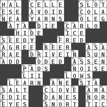 ACROSS 1. Actor Linden 4. Cell (Danish) 9. Position in a hierarchy or organization 13. Compass dir. 14. Prevent the occurrence of 15. Root beer relative 16. Teachers' org. 17. Tall tales 18. Cassini of fashion 19. _ moment's notice (2 wds.) 21. Pass on 22. Monte _, Las Vegas Hotel/Casino 24. Flintstone garb 26. Frozen water 27. Morally degraded 29. Flintstone 30. Match 31. Fermented drink made from hops 33. White ___ sheet 36. Actress Charlotte 37. Popular '50s hangout 40. Player for Phoenix 41. Find the sum of 42. Wrote a lyric poem 43. NE Netherlands city 45. Writing tablets 47. Annoying sound 48. Cards in a Roman deck? 49. Coldest temperatures 50. Memorize 52. A saturated hydrocarbon 54. R.R. building 56. Table seasoning 57. Garlic unit 59. Wet nurse (var.) 61. Singer Brickell 62. Natives or inhabitants of Denmark 63. And not 64. Sight organs 65. Derisive sound 66. Nervous spasm DOWN 1. Layer 2. Toward the sea 3. Tough but pliablecoriaceous 4. Island 5. Dodge 6. Australian parrot (variant) 7. Actor's bit 8. Begley and Asner 9. Tallied 10. Hang loosely or laxly 11. Butter sub 12. Label 20. Assistant 22. High-altitude cloud 23. Adept person 25. Colored 27. "Two Mules for Sister ____" 28. Mild oath 29. Nourish 31. Auction offers 32. First lady 33. Aide 34. Institutes legal proceedings 35. Singer Murray 38. "The Thinker" sculptor 39. Billionth: prefix 44. Sty mamas 45. Food holders 46. Wind 49. Prying instrument 50. Kenny Rogers chart-topper in '80 51. Writer Wiesel 52. ____ Jay Lerner 53. Words to Nanette 55. Mine, in Marseilles 56. Perceive with the eye 57. Music discs 58. Eastern Standard Time (abbr.) 60. Curve