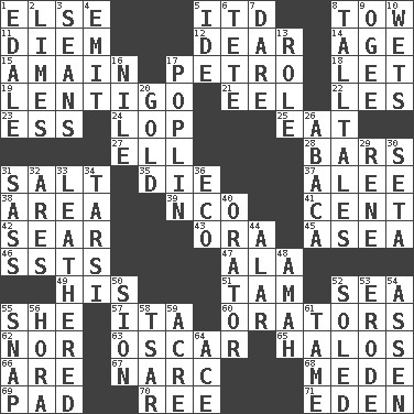 ACROSS 1. Otherwise 5. It would 8. Pull behind 11. South Vietnam president (1954) 12. Letter starter 14. Grow older 15. At full speed 17. Stone: prefix 18. Allow 19. Small, flat, pigmented spot on the skin 21. Snakelike fish 22. French article 23. Curvy letter 24. Chop off 25. Ingest 27. Pipe bend 28. Long, evenly shaped pieces 31. Table seasoning 35. Pass on 37. Toward shelter 38. Length times width 39. Non-commissioned officer (abbr.) 41. Penny 42. Wither 43. Mouth or opening 45. At sea 46. Fast planes 47. According to 49. Part of HMS, perhaps 51. Scottish cap 52. Ocean 55. A female animal or person 57. Call ___ day 60. Speakers 62. Not either 63. Motion picture award 65. Auras 66. "We ___ not amused" (Victoria) 67. Drug cop 68. Ancient Persian 69. Groovy apt. 70. To separate or throw off 71. Paradise DOWN 1. Peak District village in England 2. Citrus fruits 3. Actors Connery and Penn 4. Give off 5. Binary compound 6. Wig 7. Have the gumption 8. Baron Munchausen's specialties 9. Double curve, resembling the letter S 10. Moistens 13. Hero or heavy, e.g. 16. Mediterranean tributary 17. Cotton for raincoats, e.g. 20. Gilt 26. Phillipine bananalike plant 29. French philosopher Descartes 30. Bristle 31. Backtalk 32. Ancient Greek god of war 33. Tough but pliablecoriaceous 34. Tarsus (plural) 36. Environmental prefix 40. Speaker 44. Having or resembling wings 48. Nursemaid 50. The Jewish people; Israel 52. Having a sole or soles 53. Wear away 54. NE Netherlands city 55. Fastener 56. Israeli folk dance 58. Russian ruler of old 59. Measure of real estate 61. Not wild 64. Adept person