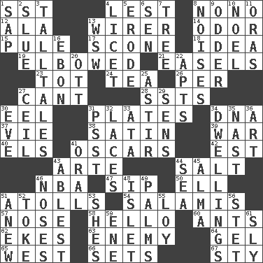 ACROSS 1. Fast jet (abbr.) 4. For fear that 8. Words to Nanette 12. In the manner of 13. One who wires 14. Aroma 15. Whine 17. Biscuitlike quick bread 18. It may be bright or harebrained 19. Shoved, as through a crowd 21. Artist's stands 23. Small child 24. Beverage made from leaves 26. For each 27. Patter 28. Fast planes 30. Snakelike fish 31. Food holders 34. Heredity factor (abbr.) 37. Compete 38. Smooth fabric 39. Armed conflict 40. Raised railways 41. Motion picture awards 42. Eastern Standard Time (abbr.) 43. Johnson of "Laugh-In" 44. Table seasoning 46. Basketball assoc. 47. Small drink 50. Pipe bend 51. Ringlike coral islands and reefs 54. Deli grouping 57. Sense of smell 58. Phone greeting 60. Pismires 62. Makes supply last 63. Foe 64. Set 65. Compass direction 66. Puts into a specified state 67. Filthy place DOWN 1. Plant excrement 2. Turn sharply 3. Baron Munchausen's specialties 4. It is permitted: Lat. 5. Wear away 6. Elected rep. 7. Woody plant 8. Annoying sounds 9. More peculiar 10. Christmas carol 11. Mouths or openings 13. Compass dir. 16. Inky black, to poets 20. Baseball player Mel 22. Tenement units (abbr.) 25. Moving or stirring 27. To provide with a ceiling 29. Elected reps. 30. First lady 31. Inconspicuous attention getter 32. Shoestrings 33. _ moment's notice (2 wds.) 34. Residences 35. Political cartoonist Thomas 36. Tate display 41. Of the mouth 43. Most capable 44. Ocean 45. _ mater 46. Olfactory organs 48. Small island 49. Insides of hands 51. Afresh 52. Puff or smoke 53. "______ My Girl" (Turtles hit) 55. Myrna of the movies 56. Proofreading order 59. Compass dir. 61. Roguish