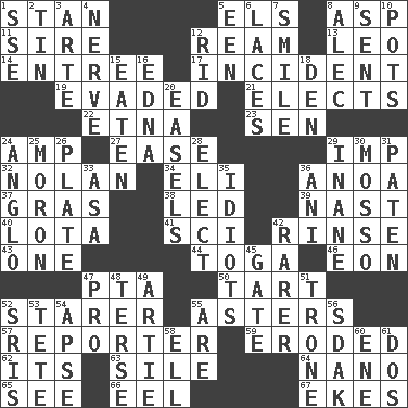 ACROSS 1. Comedian Laurel of Laurel & Hardy 5. Raised railways 8. Viper 11. Male parent of an animal 12. 480, 500 or 516 sheets of paper 13. Lion 14. Main course 17. Happening 19. Dodged 21. Chooses 22. Inactive volcano in Sicily 23. Elected rep. 24. Electrical Unit 27. Relaxation 29. Naughty child 32. Pitcher Ryan 34. Biblical high priest 36. Small Philippine buffalo 37. Pate de foie ____ 38. Directed 39. Political cartoonist Thomas 40. Globular water bottle used in Asia 41. _-fi 42. Wash lightly 43. Single 44. Ancient Roman robe 46. A really long time 47. Parent Teacher Association (abbr.) 50. Small pie 52. A viewer who gazes fixedly 55. Michaelmas daisies 57. Newsperson 59. Worn away 62. ___ a Wonderful Life 63. Filth; sediment 64. Billionth: prefix 65. Perceive with the eye 66. Snakelike fish 67. Makes supply last DOWN 1. Compass dir. 2. Metal container 3. Johnson of "Laugh-In" 4. Effrontery 5. Car or cant ending 6. Shoestrings 7. Grin 8. Actor Baldwin 9. Transmitted 10. Cooking vessels 12. To free from 15. Ingested 16. Pulitzer Prize-winning author Ferber 18. Lair 20. Artist's stands 24. White American of non-Hispanic descent 25. Person of subnormal intelligence 26. Food holder 28. Choose 29. Empty; void 30. With motion or animation 31. Eucharist need 33. White ___ sheet 35. Foolish or stupid persons 36. Cuckoo 42. More valued for its uncommonness 45. Yard entry 47. Adept person 48. Laconic 49. Nick name for Arthur 51. Marketplace scale 52. Indian titles of respect 53. False hair 54. Domed church section 55. "We ___ not amused" (Victoria) 56. Neighbor of Neb. 58. Pipe bend 60. Compass dir. 61. Two (Sp.)