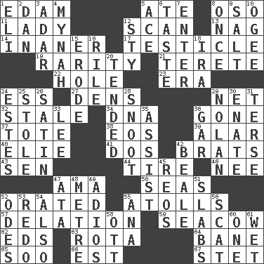 ACROSS 1. Dutch treat 5. Had dinner 8. Bear (Spanish) 11. Kenny Rogers chart-topper in '80 12. Skim 13. Tired old horse 14. More lacking in sense or substance 17. A testis 19. Noteworthy scarcity 21. Cylindrical with tapered ends 22. Hollow 23. Period 24. Double-curved letter 27. Habitations of wild animals 29. Fish or hair follower 32. Lacking originality or spontaneity 34. Heredity factor (abbr.) 36. Went 37. Lug 38. Greek goddess of the dawn 39. Having or resembling wings 40. Writer Wiesel 41. Two (Sp.) 42. Naughty children 43. Elected rep. 44. Become fatigued 46. Born 47. Nursemaid (var.) 50. Oceans 52. Spoke pompously 55. Ringlike coral islands and reefs 57. Conveyance 59. Manatee 62. Begley and Asner 63. Roll call or roster of names 64. Object of repulsion 65. "Barney Miller" actor Jack 66. Eastern Standard Time (abbr.) 67. Proofreading order DOWN 1. Connecticut Ivy Leaguer 2. Daniel's nick name 3. The sixth month of the Jewish calendar 4. Non-adult bird? 5. Adept person 6. Clothes sense 7. Keyboard key 8. At one time in the past 9. Table seasoning 10. Double curve, resembling the letter S 12. Filthy place 15. Wear away 16. Cause heat under the collar 18. Retirement account (abbr.) 20. Looked after 24. _____ Park, CO 25. Took without asking 26. Smooth fabric 28. Snout, nose 29. Pitcher Ryan 30. Related on the mother's side 31. Laconic 33. Area sheltered from the wind 35. Help 36. Slender fish 42. Calif. Air Force Base 45. Vintage cars 47. "One Day ___ Time" 48. Distance measurement (Brit.) 49. Goodbye (Sp.) 51. Thick slices 52. Lyric poems 53. Do over again 54. In addition 55. Santa ___, CA 56. Get outta here! 58. Baseball player Mel 60. Single 61. Dripping