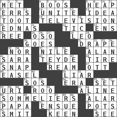 ACROSS 1. Was introduced to 4. Expressions of contempt or scorn 8. Pile 12. Blunders 14. Join together 16. The content of cognition 17. A blast of a horn 18. Household entertainment appliance 20. Ferber et al. 22. Nervous spasm 23. Followers of ems 24. To sift 25. Bear (Spanish) 28. Lion 30. Travels 31. Window treatment 35. Not either 37. Mediterranean tributary 40. ____ Jay Lerner 41. "Two Mules for Sister ____" 42. Miss Universe 1986, Barbara Palacios _ 44. Become fatigued 45. Fastener 46. 480, 500 or 516 sheets of paper 47. Baseball player Mel 48. Artist's stand 50. One who doesn't tell the truth 52. Mayday 54. Epoch 55. Arrange properly for use 58. RI univ. 61. Friend of Pooh 63. Place in a line 65. Wine waiters 70. Having or resembling wings 71. Dad 72. Follow as a consequence or result 73. Plant holders 74. Stricken, poetically 75. Peachy ____! 76. Observe DOWN 1. Distance measurement 2. Wear away 3. Marketplace scale 4. With the exception that 5. Single 6. Petroleum 7. Proofreading order 8. Part of HMS, perhaps 9. Singer Brickell 10. Period of immesurable duration 11. Baking dishes 13. R.R. building 15. Tending to cause great harm 19. On the rocks 21. "Barney Miller" actor Jack 26. Emitted 27. Flexible twig of a willow tree 29. Speaker 30. Raisin fruits 32. Set down 33. Piece 34. Compass dir. 35. Grandmother 36. Mouths or openings 38. Sodium hydroxide 39. Peak District village in England 41. Compass dir. 43. Independent ruler or chieftain 49. Old wives' tales, e.g. 51. Auto club (abbr.) 53. Flatfish 55. Grain storage towers 56. Maternal 57. Laconic 58. United States Postal Service (abbr.) 59. Wander 60. Body of Kaffir warriors 62. Pig sound 64. Pet locale 66. Floor covering 67. Compass dir. 68. Regret 69. Elected rep.