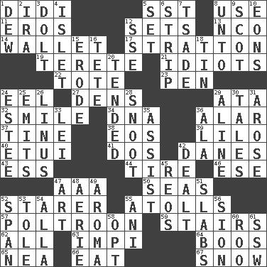 ACROSS 1. "You Light Up My Life" star Conn 5. Fast jet (abbr.) 8. Purpose 11. Greek god of love 12. Arranges properly for use 13. Non-commissioned officer (abbr.) 14. Place for singles 17. Ski resort town in Vermont 19. Cylindrical with tapered ends 21. Foolish or stupid persons 22. Carryall 23. Animal enclosure 24. Snakelike fish 27. Hiding places for outlaws 29. _ moment's notice (2 wds.) 32. Grin 34. Heredity factor (abbr.) 36. Having or resembling wings 37. Prong on a fork 38. Greek goddess of the dawn 39. _ and Stitch 40. Needle holder 41. Two (Sp.) 42. Natives or inhabitants of Denmark 43. Double-curved letter 44. Hoop that covers a wheel 46. Compass dir. 47. American Automobile Association (abbr.) 50. Oceans 52. A viewer who gazes fixedly 55. Ringlike coral islands and reefs 57. Coward 59. Flight of steps 62. 100% 63. Body of Kaffir warriors 64. Expressions of contempt or scorn 65. Teachers' org. 66. Ingest 67. Overwhelm DOWN 1. Morning condensation 2. Lyricist Gershwin 3. Dunce 4. Small island 5. Arrange properly for use 6. Long narrow piece of something 7. Sadhe (variant) 8. To (old English) 9. Highlander 10. Immeasurably long periods of time 12. Compass dir. 15. Eat (away) 16. False hair 18. Shallow baking pan 20. Watched over 24. First name in cosmetics 25. Sends forth 26. "_ and Lucy" (Charlie Brown theme song) 28. Snob 29. Place in a line 30. Stories 31. Came up 33. Luau accessory 35. Help 36. According to 42. Started a card game 45. Vintage cars 47. Nonscientific branch of learning 48. Nest on high 49. Scent 51. Thick slices 52. Connect, as a bridge 53. Lacquered or enameled metalware 54. Silent film actress Nazimova 55. Black tropical American cuckoo 56. The Jewish people; Israel 58. Elect 60. Friend of Pooh 61. Compass dir.