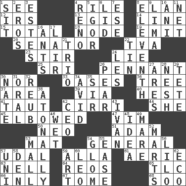 ACROSS 1. Observe 4. Cause heat under the collar 8. Liveliness 12. Big collection agency 13. The front part of a cuirass 14. Actor's bit 15. "_____ Recall" 18. Thickened enlargement 19. Send forth 20. Elected representative 22. Federal power corp. 23. Commotion 24. Falsehood 25. _ Lanka 26. Pre-World Series prize 30. And not 33. Fertile tracts in a desert 36. Family _ (genealogy) 37. Length times width 39. By way of 40. Behest 41. Tense 42. High-altitude cloud 44. A female animal or person 45. Turned at an angle; bent 47. Zeal 50. Modern: prefix 51. First man 53. Floor covering 54. Commissioned military rank 57. Hereditary estate 59. Silent film actress Nazimova 61. Nest on high 63. 1994 drama film starring Jodie Foster 64. Vintage cars 65. Affectionate concern, for short 66. In an inward manner 67. Heavy book 68. "Barney Miller" actor Jack DOWN 1. Be seated 2. Greek god of love 3. _____ Park, CO 4. Former U.S. Attorney General Janet 5. Composer Stravinsky 6. Flaplike covering 7. Compass dir. 8. Veterans Day date 9. Pale green bean 10. Cuckoo 11. Remaining after all deductions 16. Pismires 17. Den 21. Musical group of three 22. Shallow baking pan 24. French article 26. Lightbulb-shaped fruit 27. Ancient Greek god of war 28. Delicate 29. Wig 30. Nathan's nickname 31. Spoken 32. Reuben's nickname 34. Enthusiastic 35. Title for a knight 38. Without tonality 42. Corporate head (abbr.) 43. "Terrible" tsar 46. Dripping 48. The content of cognition 49. Female horse 52. Shops 53. Promenade 54. Seize upon or latch onto something 55. Relaxation 56. _ and Stitch 57. Corn or form start 58. Lair 59. Nonscientific branch of learning 60. Lion 62. Environmental prefix