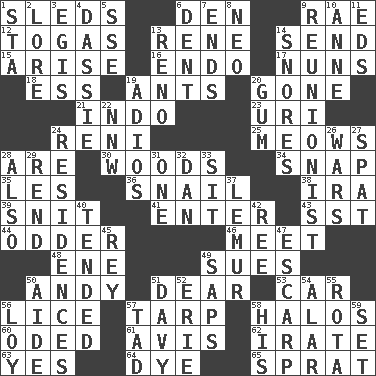 ACROSS 1. Bobsleighs 6. Lair 9. Actress Charlotte 12. Ancient Roman robes 13. French philosopher Descartes 14. Transmit 15. Originate 16. Inside; within (prefix) 17. Religious women 18. Curvy letter 19. Pismires 20. Went 21. Southeast Asian peninsula 23. RI univ. 24. Painter Guido (1575-1642) 25. Catcalls? 28. "We ___ not amused" (Victoria) 30. Forest 34. Fastener 35. French article 36. Slow-paced one 38. Lyricist Gershwin 39. In a ____ (agitated or irritated) 41. Keyboard key 43. Fast jet (abbr.) 44. More peculiar 46. Rendezvous 48. Compass dir. 49. Institutes legal proceedings 50. "60 Minutes" Commentator Rooney 51. Letter starter 53. Automobile 56. Louse (plural) 57. Canvas cover 58. Auras 60. Wrote a lyric poem 61. Deliberation 62. Feeling or showing extreme anger 63. Affirmative reply 64. Color 65. Small fatty European fish DOWN 1. R.R. building 2. Old wives' tales, e.g. 3. Armor plate that protects the chest 4. Hyrax 5. Compass dir. 6. Undesirable depression on a surface 7. Conclusions 8. Modern: prefix 9. One who advocates reunion 10. Queen of England 1702-14 11. Begley and Asner 13. Western Nevada city 14. Sounds asleep 19. Goodbye (Sp.) 20. Chewing product 22. Compass dir. 24. Homes 26. Armed conflicts 27. Argument over a trivial matter 28. In addition 29. Tear apart 31. Single 32. Daniel's nick name 33. Be seated 37. Arboreal primate 40. Watched over 42. To separate or throw off 45. Marina Del _, California 47. Fortification 49. Plant excrements 50. Helper 51. American folk hero Crockett 52. 4th largest of the Great Lakes 54. Having or resembling wings 55. Roll call or roster of names 56. Myrna of the movies 57. Small boy 58. Part of HMS, perhaps 59. Arrange properly for use