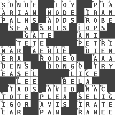 ACROSS 1. Message 6. Myrna of the movies 9. Parent Teacher Assoc. 12. Believer in; advocate of (suffix) 13. Method 14. SW Asia republic 15. Insides of hands 16. Sums up 17. Loose flowing garment 18. Ocean 19. Indian titles of respect 20. Chops off 21. Yard entry 23. Black tropical American cuckoo 24. False hair 25. _ dish (used to culture cells) 28. Third mo. 30. Nest on high 34. South Vietnam president (1954) 35. Period 36. Cowboy competition 38. Auto club (abbr.) 39. Habitations of wild animals 41. Beat drum 43. Attempt 44. Artist's stand 46. Louse (plural) 48. Area sheltered from the wind 49. Actor Lugosi 50. Bits 51. Enthusiastic 53. Big _ 56. Carryall 57. Entreaty 58. Major League Baseball Commissioner Bud 60. Russian composer Stravinsky 61. Opinion 62. Feeling or showing extreme anger 63. Hearing organ 64. Baking dish 65. Indian princess (variant) DOWN 1. Plant excrement 2. Mouths or openings 3. Mediterranean tributary 4. Break 5. Followers of ems 6. Farming town in central California 7. Likelihood 8. Consenting reply 9. Appease 10. Bar bills 11. One (Scot) 13. Female horse 14. Pressed 19. Guide 20. Infant locale 22. _ moment's notice (2 wds.) 24. Interpreter 26. Posterior 27. "If ____ say so..." 28. Ancient Persian 29. Type of rug 31. Director Reiner 32. Wedding promise 33. Car or cant ending 37. Stared at amorously 40. Sowing specialist 42. Lubricate 45. French article 47. Device for capturing images 49. Prejudice 50. Ancient Roman robe 51. Inventor's middle name 52. Distinctive style or manner 54. ____ Jay Lerner 55. Quote 56. Make a knot 57. Infant food 58. Title for a knight 59. Unit of force equal to gravity