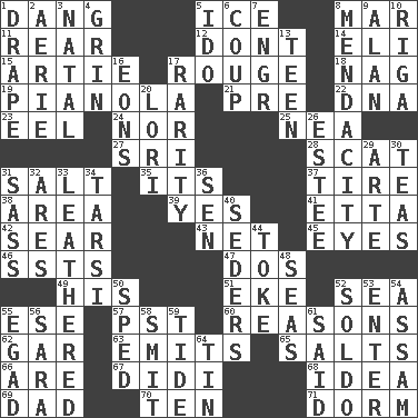 ACROSS 1. Mild oath, euphamism for damn 5. Frozen water 8. Spoil 11. Posterior 12. Do not 14. Connecticut Ivy Leaguer 15. Nick name for Arthur 17. Makeup applied to the cheeks 18. Tired old horse 19. Player piano 21. Before (prefix) 22. Heredity factor (abbr.) 23. Snakelike fish 24. Not either 25. Teachers' org. 27. _ Lanka 28. Jazz singing style 31. Table seasoning 35. ___ a Wonderful Life 37. Become fatigued 38. Length times width 39. Consenting reply 41. Singer James 42. Dry up 43. Remaining after all deductions 45. Sight organs 46. Fast planes 47. Two (Sp.) 49. Part of HMS, perhaps 51. Make supply last 52. Ocean 55. Compass dir. 57. Pacific Standard Time (abbr.) 60. Thinks logically 62. Slender fish 63. Gives off 65. Table seasonings 66. "We ___ not amused" (Victoria) 67. "You Light Up My Life" star Conn 68. It may be bright or harebrained 69. June honoree 70. "___ Little Indians" 71. Dormintory (informal) DOWN 1. Window treatment 2. Nest on high 3. Brizilian seaport 4. Broad smile 5. Wedding promise 6. Overturn; upset 7. Engineer (abbr.) 8. Ananias' fault 9. ____ Jay Lerner 10. Port city in Latvia 13. Adolescent 16. Immeasurably long periods of time 17. Noteworthy scarcity 20. Australian parrot (variant) 26. First name in cosmetics 29. Johnson of "Laugh-In" 30. Afternoon social gatherings 31. Backtalk 32. Ancient Greek god of war 33. Tough but pliablecoriaceous 34. Tarsus (plural) 36. Elected rep. 40. Spring feasts 44. Casino tip 48. Oceans 50. Hurried 52. Twentieth part of a lira 53. Keyboard key 54. Indian state 55. Mild oath 56. "Two Mules for Sister ____" 58. Stricken, poetically 59. Periodic rise and fall of the sea level 61. Stated 64. Shallow baking pan