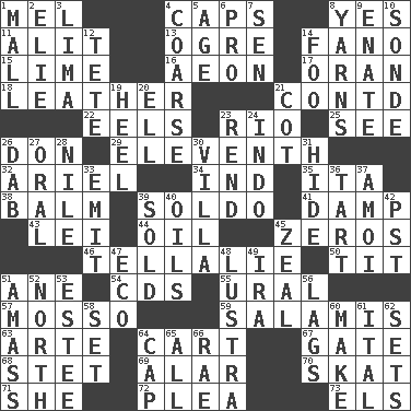 ACROSS 1. Cartoonist voice _ Blanc 4. Balmoral and tarboosh 8. It is so 11. Set down 13. Legendary monster 14. Papal veil 15. Citrus frut 16. Period of immesurable duration 17. Northwest Algerian city 18. Cordwainer's material 21. Continued (abbr.) 22. Snakelike fish 23. River (Sp.) 25. Perceive with the eye 26. Spanish title 29. Veterans Day date 32. Satellite of Uranus 34. Working for oneself (abbr.) 35. Call ___ day 38. Lip ointment 39. Twentieth part of a lira 41. Moist 43. Luau accessory 44. Lubricate 45. Nothings 46. Copy Pinocchio 50. Teat (slang) 51. A saturated hydrocarbon 54. Music discs 55. Mountain range 57. With motion or animation 59. Deli grouping 63. Johnson of "Laugh-In" 64. Heavy open wagon 67. Yard entry 68. Proofreading order 69. Having or resembling wings 70. Three-handed card game 71. A female animal or person 72. Entreaty 73. Raised railways DOWN 1. Shopping center 2. Writer Wiesel 3. Pale green bean 4. Unrefined 5. Ripen 6. Adept person 7. Elected rep. 8. Tall tales 9. Maternal 10. Message 12. Wig 14. Egg _ yung 19. The bottom of a shoe or boot 20. Pipe bend 21. Small bed 23. Tear apart 24. _ china 26. Small moist lump or mass 27. Taken by mouth 28. The longest river in the world 30. Country estate 31. Flintstone garb 33. Send forth 36. Small pie 37. Mine, in Marseilles 39. Disposed of to a purchaser 40. Lubricates 42. Pacific Standard Time (abbr.) 45. Ardor 47. Environmental prefix 48. A period of five years 49. Retirement account (abbr.) 51. Collect or gather 52. _ pole 53. First name in cosmetics 56. Falls behind 58. Put into a specified state 60. Cause to be 61. Slanted text style (abbr.) 62. Arranges properly for use 64. Head covering 65. 100% 66. Actress Charlotte
