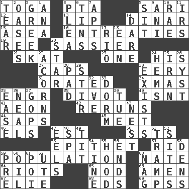 ACROSS 1. Ancient Roman robe 5. Parent Teacher Association (abbr.) 8. Indian skirt 12. Merit 13. Mouth edge 14. Middle Eastern gold or silver currency 15. At sea 16. Pleas 19. Portuguese money of account (variant) 20. More disrespectful 21. Three-handed card game 23. Single 24. Part of HMS, perhaps 27. Smile enhancers 30. Suggestive of the supernatural 31. Declaimed 34. Dec. holiday 35. Engineer (abbr.) 38. A piece of turf (Scot.) 40. Is not 41. A really long time 42. Summer TV shows 44. Plant excrements 45. Confront 46. Raised railways 47. Eastern Standard Time (abbr.) 50. Fast planes 53. Curse 57. To free from 59. Census information 63. Nathan's nickname 64. Debaucheries 65. Allow head to fall sleepily 66. So be it 67. Writer Wiesel 68. Begley and Asner 69. Global Positioning Systems (abbr.) DOWN 1. Rend 2. Fertile tracts in a desert 3. Of Greece 4. Santa ___, CA 5. Entreaty 6. Metal containers 7. Tenement units (abbr.) 8. Be seated 9. Cuckoo 10. Actress Charlotte 11. Big collection agency 14. Have the gumption 17. _ de Janeiro 18. Car or cant ending 20. Play the lead 22. Oak nuts 24. Is hesitant and indecisive 25. SW Asia republic 26. System (abbr.) 28. Writing tablet 29. Commotion 30. Has an existence 32. Night before a holiday 33. Dormintory (informal) 35. Comfort 36. Actress Patricia 37. Republicans 39. Third day of the wk. 43. A home for chicks 47. Snakelike fish 48. Health resort 49. Teat (slang) 51. _____ steamer (cargo ship) 52. Locates 54. Prong on a fork 55. Parka part 56. Conclusions 58. Habitations of wild animals 59. Before (prefix) 60. Petroleum 61. Luau course 62. Shoshoni 63. Tired old horse