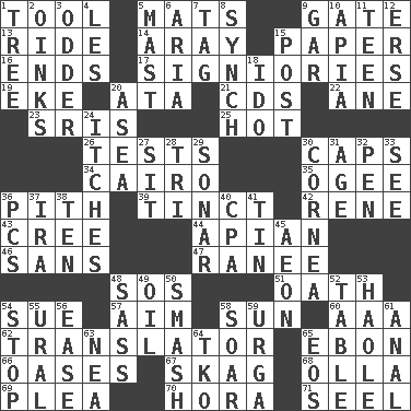 ACROSS 1. Utensil 5. Floor coverings 9. Yard entry 13. Travel on or in a vehicle 14. Like ___ of sunshine 15. Some stationery 16. Conclusions 17. Seigniories (variant) 19. Make supply last 20. "One Day ___ Time" 21. Music discs 22. A saturated hydrocarbon 23. Indian titles of respect 25. Being at a high temperature 26. Trials 30. Smile enhancers 34. Capital of Egypt 35. Double curve, resembling the letter S 36. Essential or central part 39. Tinged 42. French philosopher Descartes 43. Algonquian 44. Bee-related 46. Without 47. The wife of a rajah (variant) 48. Distress signal 51. Pledge 54. Take to court 57. Direct toward a target or goal 58. Player for Phoenix 60. Auto club (abbr.) 62. Interpreter 65. Inky black, to poets 66. Fertile tracts in a desert 67. Heroin 68. Spanish pot 69. Entreaty 70. Israeli folk dance 71. Sew up the eyelids of hawks and falcons DOWN 1. Relationship diagram 2. Pig sounds 3. More peculiar 4. French article 5. Vertical spar for supporting sails 6. Roberta Peters solo 7. Label 8. Synchronize (abbr.) 9. Slender fish 10. Capital of Western Samoa 11. Adolescent 12. Celtic language 15. Mail 18. Wedding promise 20. Toward the sea 24. Strong, restless desires 27. Be seated 28. Three (prefix) 29. Underwater navigation system 30. Pupil covering 31. Personal question 32. Writing instrument 33. Observe 36. Personal Computers (abbr.) 37. Lyricist Gershwin 38. "___ Little Indians" 40. Numbers guy (abbr.) 41. Metal container 45. Period of immesurable duration 48. Backtalk 49. Lubricate 50. Box-office sellout 52. Eating place 53. White Person, in Hawaii 54. Discontinue 55. Mountain range 56. Relaxation 58. Fly high 59. Capital and largest city of Mongolia 61. Of or related to the anus 63. Teachers' org. 64. Ring climax 65. Greek goddess of the dawn