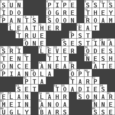 ACROSS 1. Player for Phoenix 4. Corncob 8. Fast planes 12. Wedding promise 13. Legendary monster 14. Those things 15. Leg coverings 18. Within a short period 19. Wander 20. Cordwainer's material 22. Consume 23. Loyal 24. Pacific Standard Time (abbr.) 25. Single 26. French poetic form 30. _ Lanka 33. Crowbar 36. Lyric poems 37. Portable shelter 39. Teat (slang) 40. Tender 41. Single time 42. Approach 44. Had dinner 45. Player piano 47. Choose 50. Parent Teacher Association (abbr.) 51. Canvas cover 53. Arrange properly for use 54. Sycophants 57. Liveliness 59. Cowardly lion portrayer 61. Underwater navigation system 63. Chow _ 64. Small Philippine buffalo 65. Compass dir. 66. Unsightly 67. Drinking establishments 68. Compass dir. DOWN 1. Small drink 2. Hereditary estate 3. Music written for nine 4. Airs 5. Composer Stravinsky 6. Adept person 7. Car or cant ending 8. Ski resort town in Vermont 9. Opportunity 10. Afternoon social gathering 11. Symbol (abbr.) 16. Pacific island yam 17. Make senseless or dizzy 21. The bottom of a shoe or boot 22. Double-curved letter 24. For each 26. Stalk of a moss capsule 27. The content of cognition 28. Egg locale 29. American tennis player Robert 30. Discontinue 31. Painter Guido (1575-1642) 32. South American Indian 34. Inactive volcano in Sicily 35. Compete 38. 3-inch nail 42. According to 43. Round or rotation of duties 46. Baseball player Mel 48. Writing tablets 49. Musical group of three 52. Actor Sean's family 53. Travel by water 54. Son of Odin 55. Mouths or openings 56. Without 57. Australian flightless bird 58. Part of a journey 59. Experiment locale 60. Santa ___, CA 62. To separate or throw off