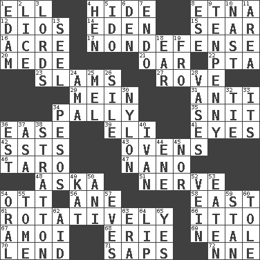 ACROSS 1. Pipe bend 4. Flintstone garb 8. Inactive volcano in Sicily 12. "Vaya con ____" 14. Genesis locale 15. Shrivel 16. 1/640 square mile 17. Unrelated to defense, as in spending 20. Ancient Persian 21. Boat paddle 22. Parent Teacher Assoc. 23. Criticizes harshly 27. Be footloose 29. Chow _ 31. Against 34. Friendly 35. In a ____ (agitated or irritated) 36. Comfort 39. Biblical high priest 41. Sight organs 42. Fast planes 43. Baking chambers 46. Pacific island yam 47. Billionth: prefix 48. "____ silly question..." 51. Effrontery 54. Baseball player Mel 56. A saturated hydrocarbon 58. 90 degrees 61. Happening in regular succession 66. "Tell ____ the Marines!" 67. Mine, in Marseilles 68. One of the Great Lakes 69. Be tempered by heat 70. Grant temporary use of 71. Plant excrements 72. Compass dir. DOWN 1. Dutch treat 2. Louse (plural) 3. Domineers 4. Layer 5. Wedding promise 6. Lair 7. Inside; within (prefix) 8. Compass dir. 9. 3-inch nail 10. Political cartoonist Thomas 11. Length times width 13. Sew up the eyelids of hawks and falcons 18. Hearing organ 19. Back 24. Nanny (var.) 25. Cartoonist voice _ Blanc 26. Drop; flow; fall 28. Flower holders 30. High-strength synthetic material 32. Standoff 33. ___ a Wonderful Life 34. Mexican monetary units 36. Eastern Standard Time (abbr.) 37. White ___ sheet 38. Ski resort town in Vermont 40. "Terrible" tsar 44. Compass dir. 45. Not either 49. Krazy ___ of comics 50. Black tropical American cuckoo 52. Distinctive style or manner 53. Ingested 54. Relating to the mouth 55. Heavy book 57. Nights before holidays 59. Comedian Laurel of Laurel & Hardy 60. Lacquered or enameled metalware 62. Help 63. Period 64. Mouth edge 65. It is so